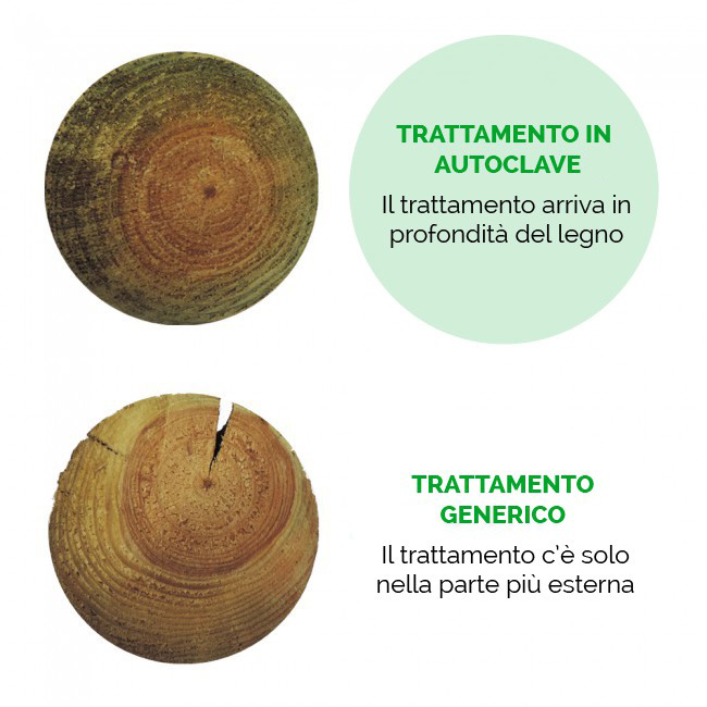 Il Trattamento in Autoclave consiste nell’immergere i Mezzi Pali in Legno di Pino all’interno di una cisterna sotto pressione piena di un’apposita soluzione ai Sali di Rame. Grazie a questo trattamento, il legno può essere tranquillamente utilizzato in esterno a contatto con il terreno senza bisogno trattamenti. Il trattamento penetra in profondità fino al cuore del palo e garantisce una totale protezione contro: