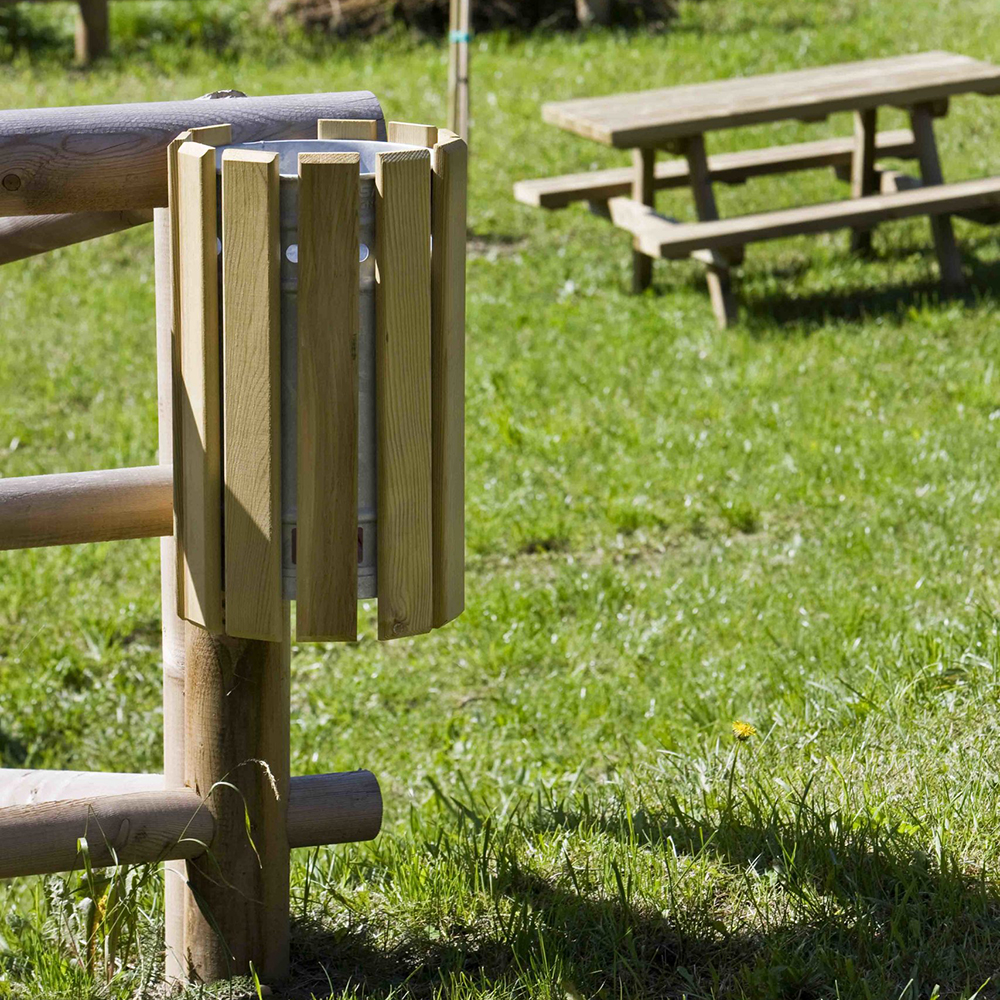 Il Cestino Arredo Urbano è realizzato in Legno di Pino Impregnato in Autoclave, pronto per l’uso esterno e protetto da Agenti Atmosferici, Funghi e Muffe.