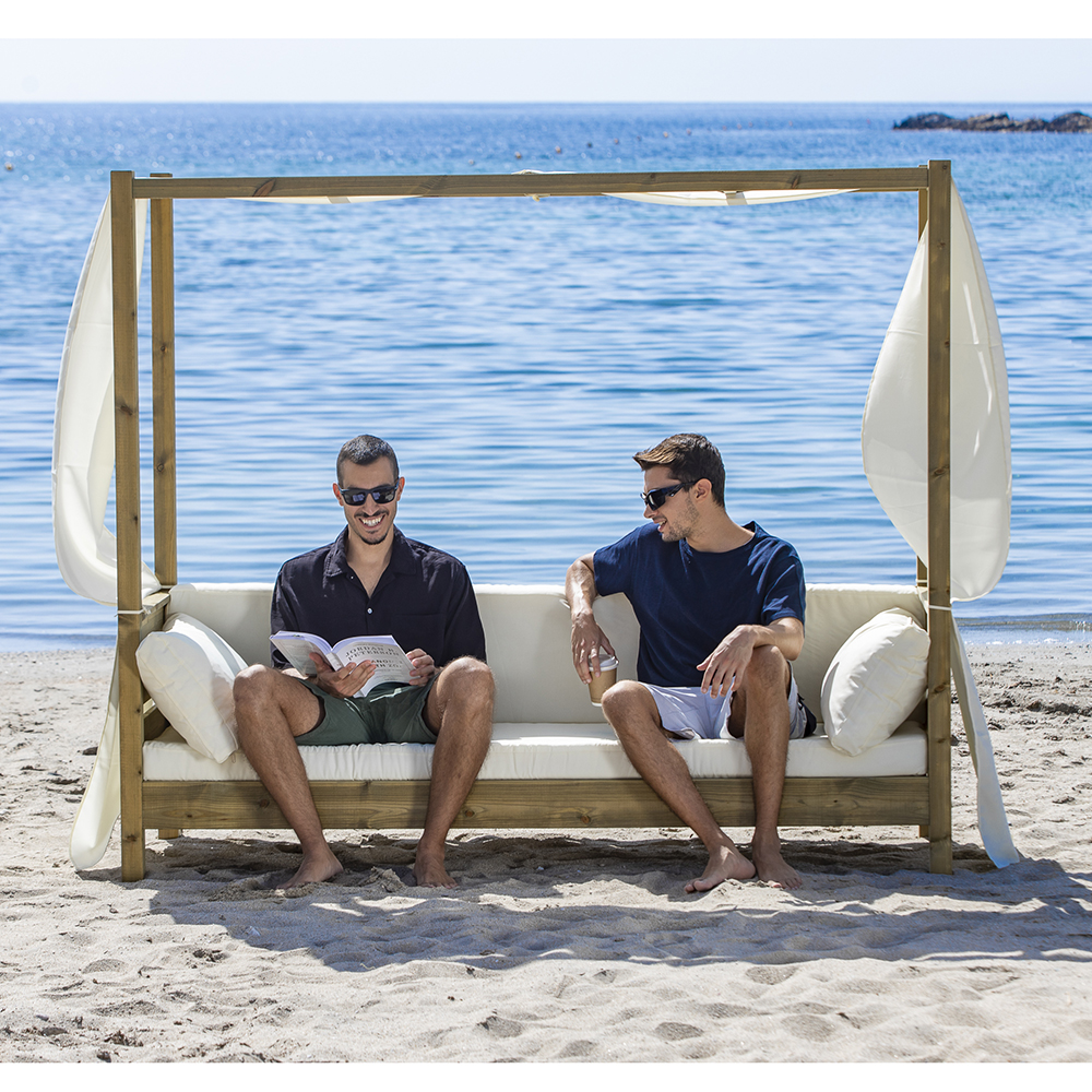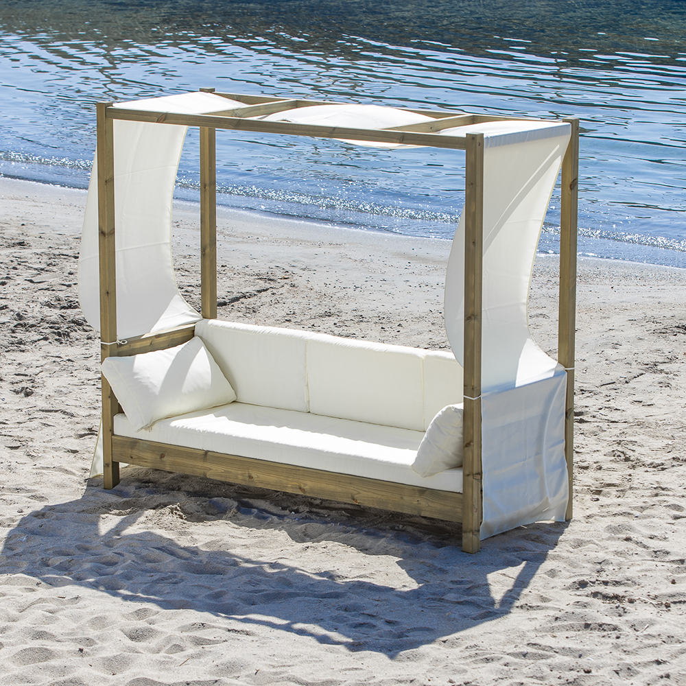 Divano da esterno in legno trattato per l’esterno perfetto per piscine, stabilimenti balneari, ma anche per un relax di vero lusso nel tuo giardino o terrazzo.