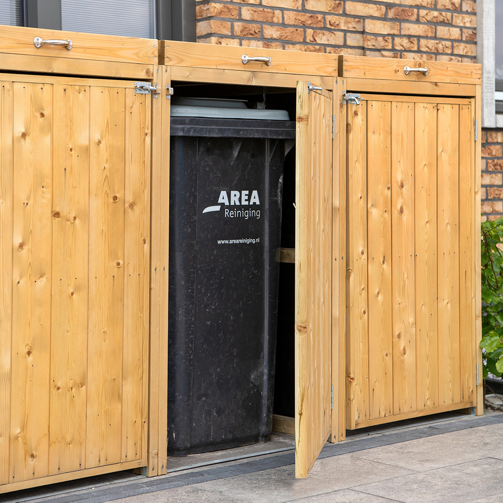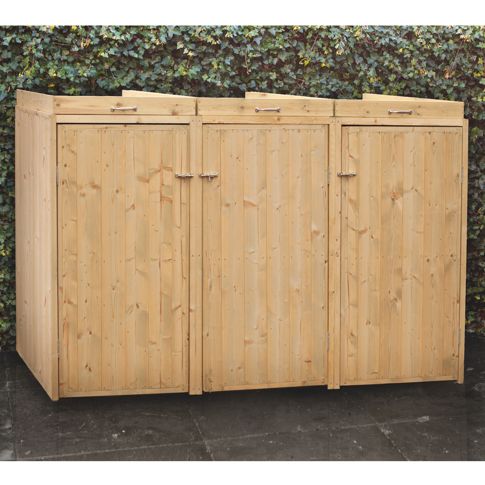 Porta bidoni da Esterno composto da 3 pratici scomparti in Legno di Pino Impregnato in Autoclave, pronto per l’uso esterno senza bisogno di manutenzione nel tempo.