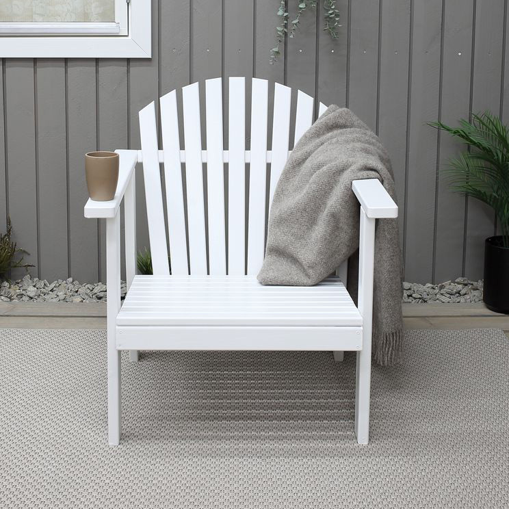 La poltrona da giardino è realizzata in legno verniciato bianco, pronta per l’uso esterno senza bisogno di trattamenti.