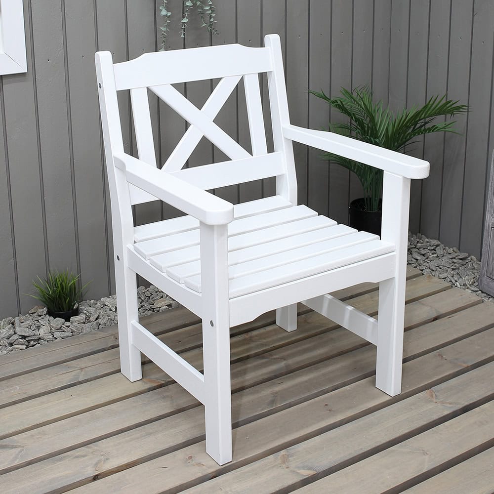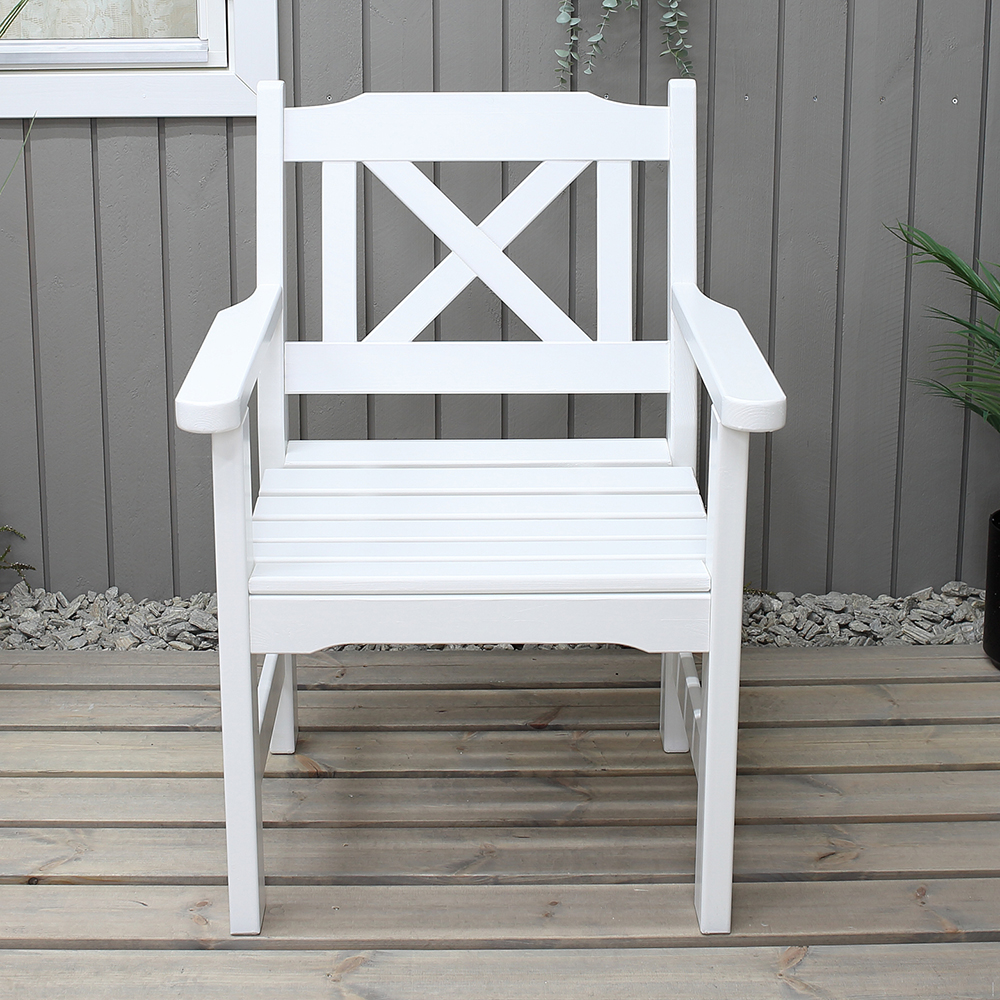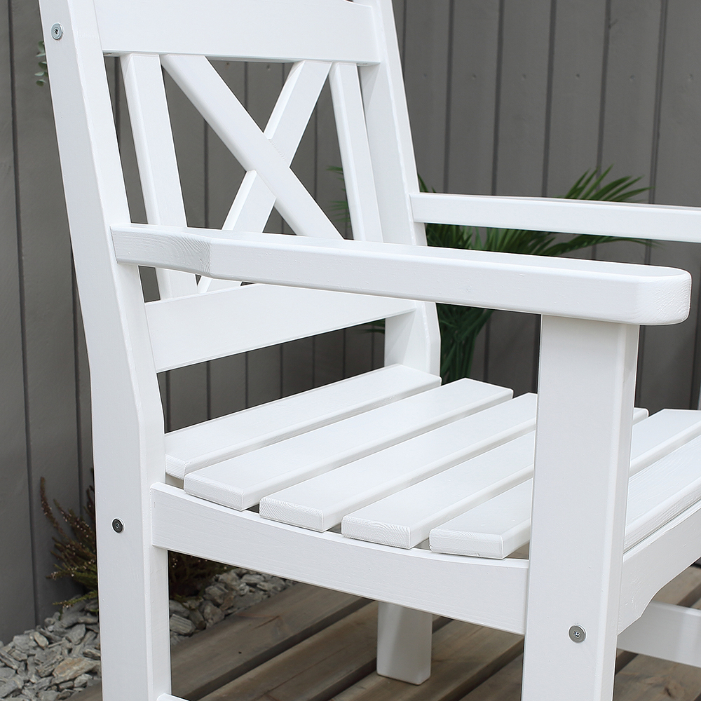 La poltrona da giardino è realizzata in legno verniciato bianco, pronta per l’uso esterno senza bisogno di trattamenti.