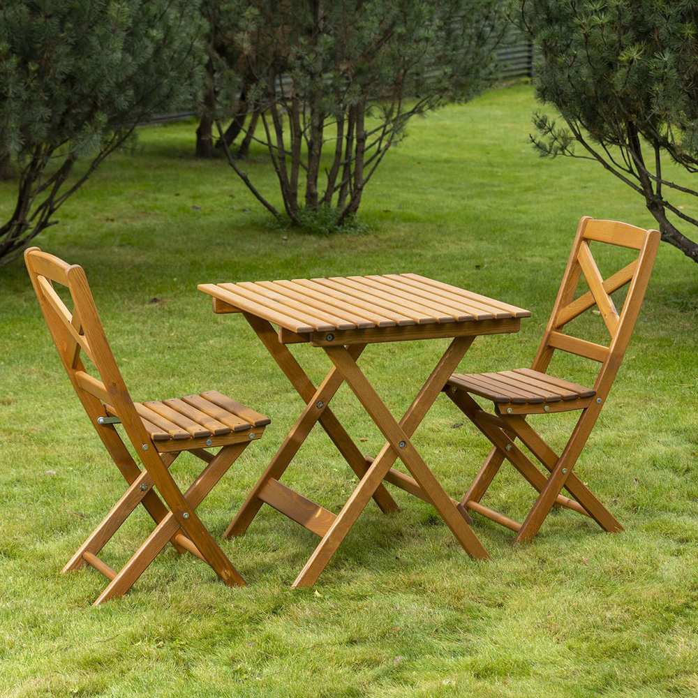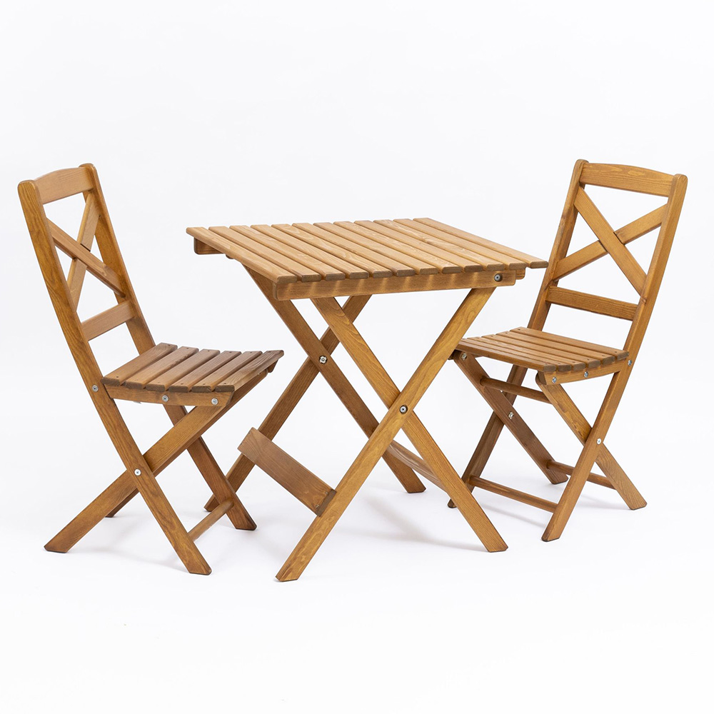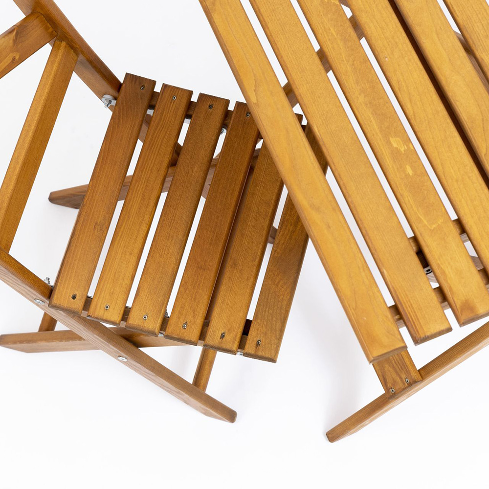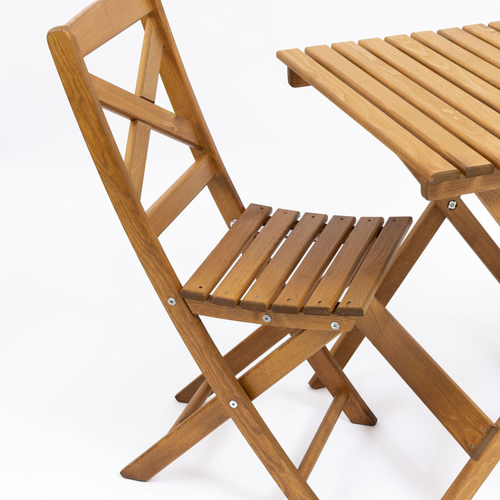 Il set da giardino tavolo e sedie è realizzata in legno verniciato miele, pronta per l’uso esterno senza bisogno di trattamenti.