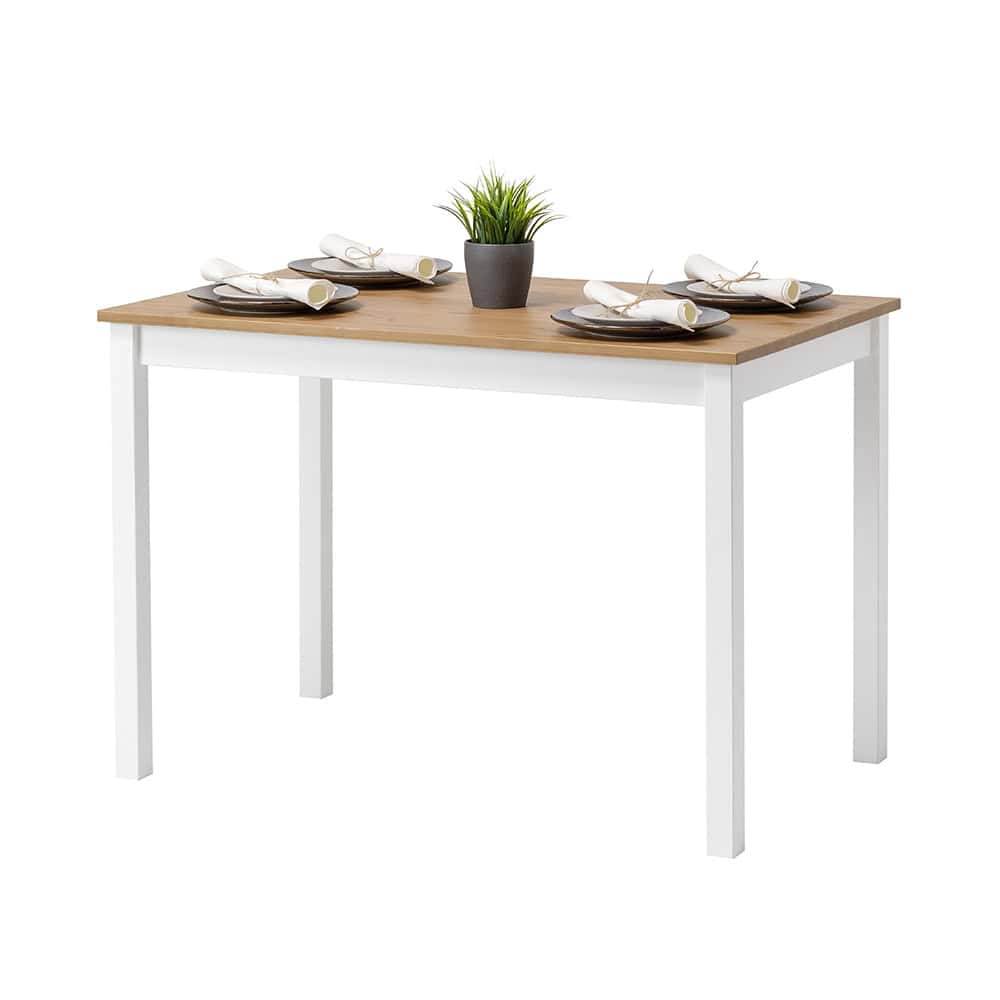 Tavolo in legno massello con piano nel colore naturale e finiture in bianco, perfetto come tavolo da pranzo dalle linee pulite e moderne.