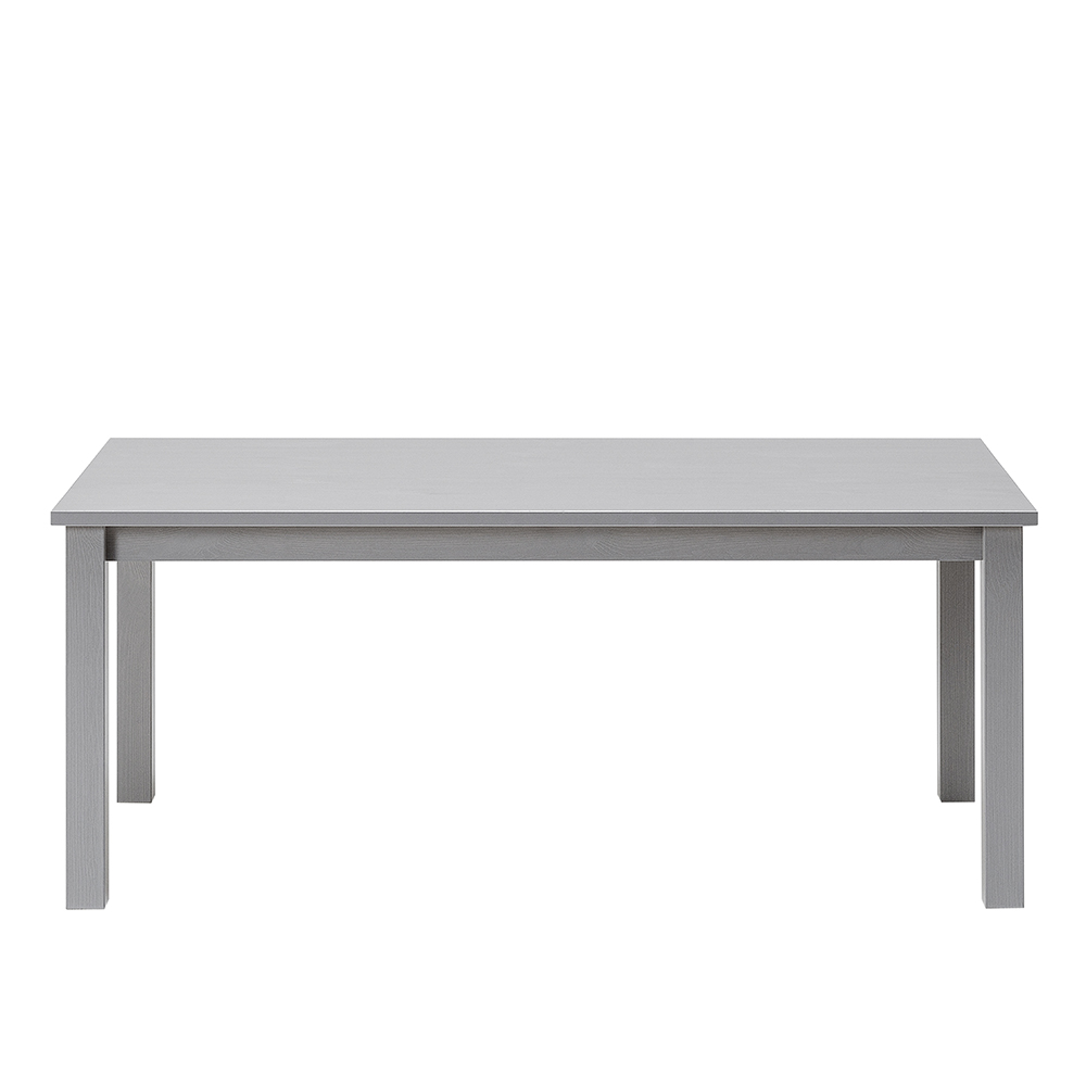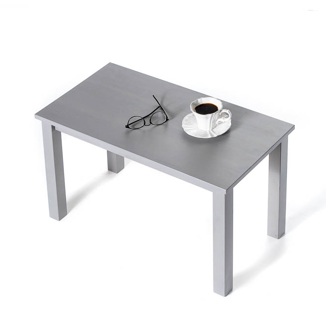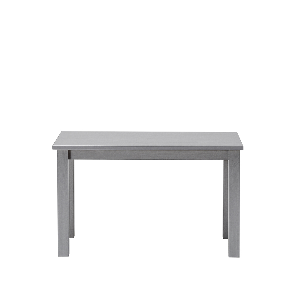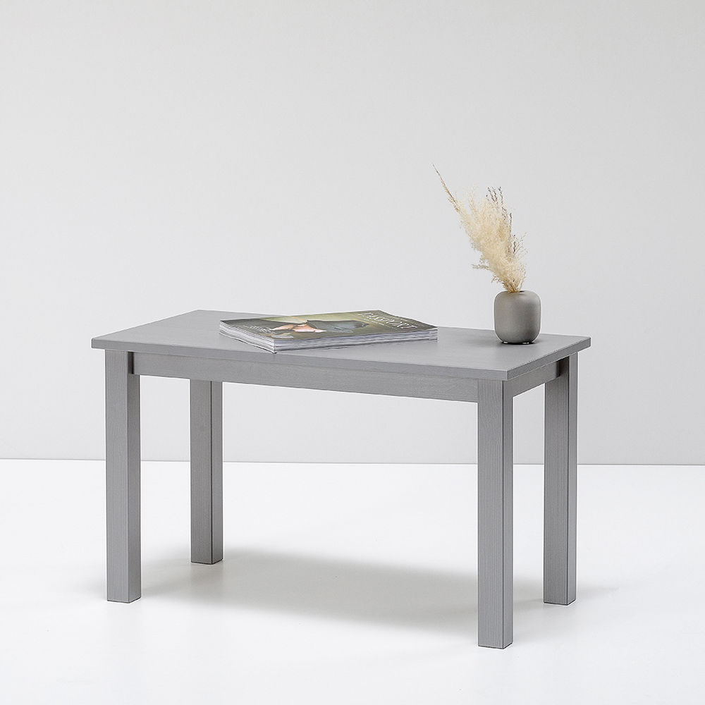 Tavolino da salotto in legno massello verniciato grigio chiaro dalle linee pulite e moderne.