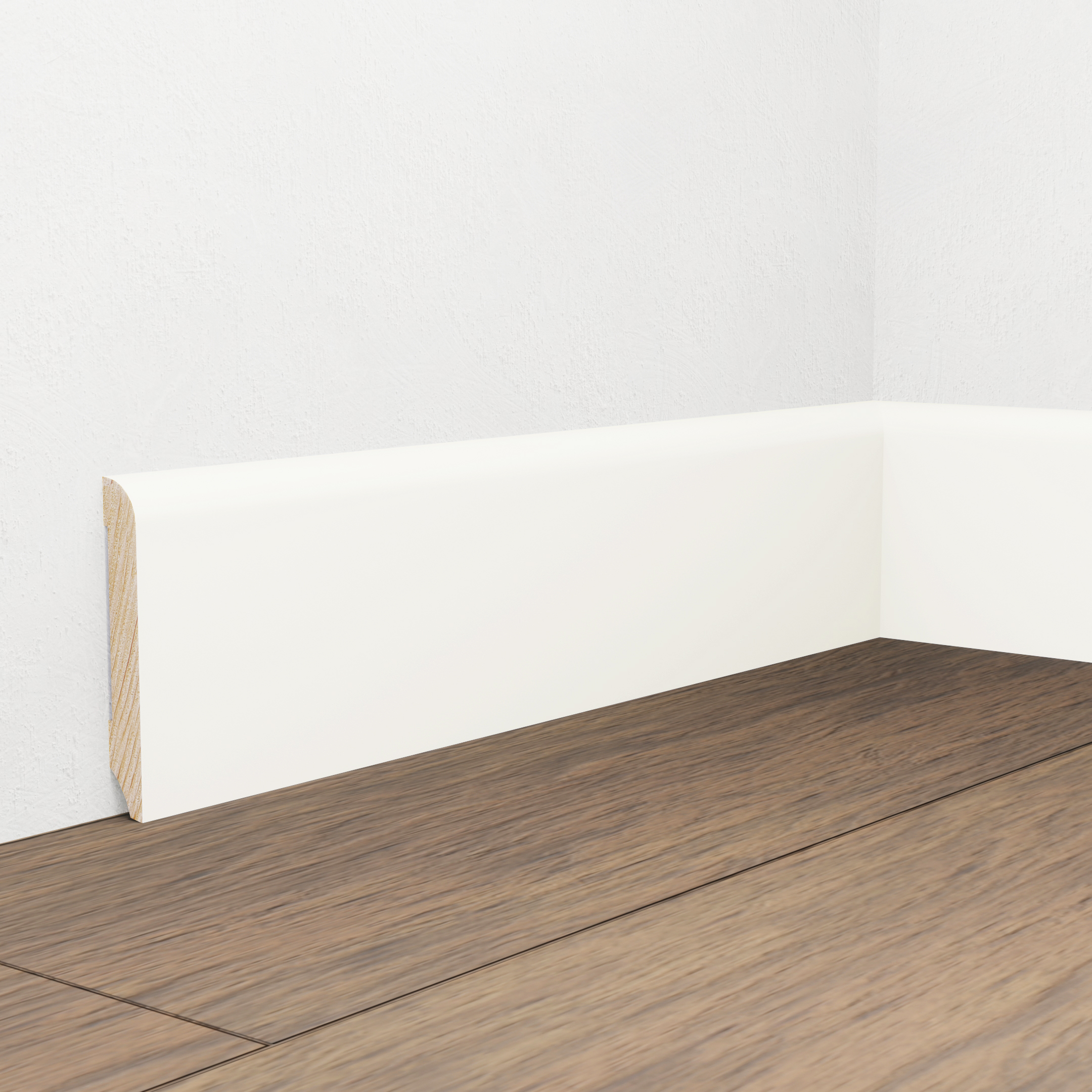 Battiscopa Legno Bianco RAL 9010 realizzato in legno di Abete Rosso di Prima Qualità impiallacciato adatto ad ogni pavimento e ad ogni tipo di ambiente.