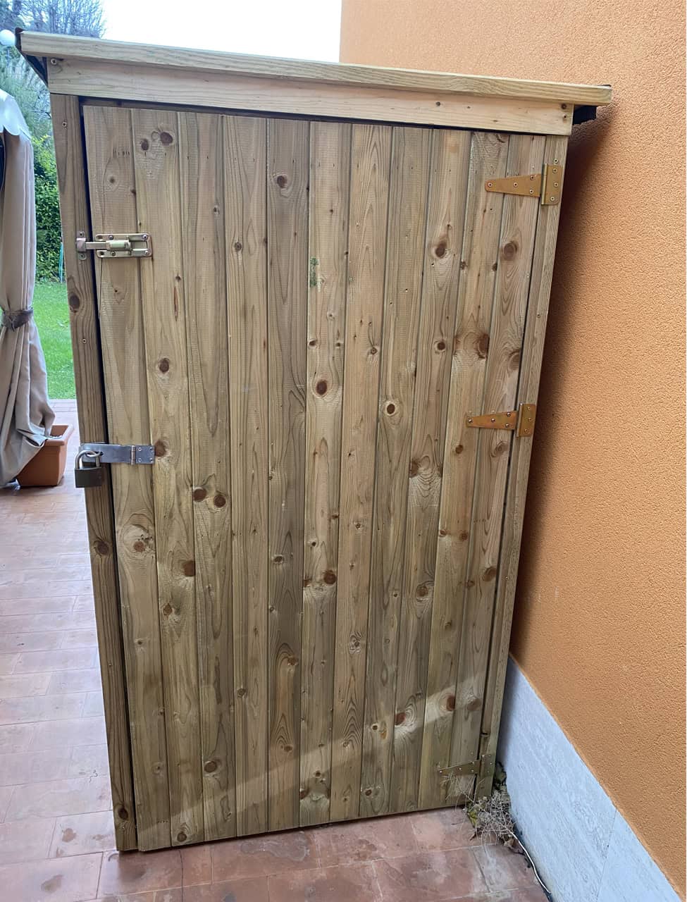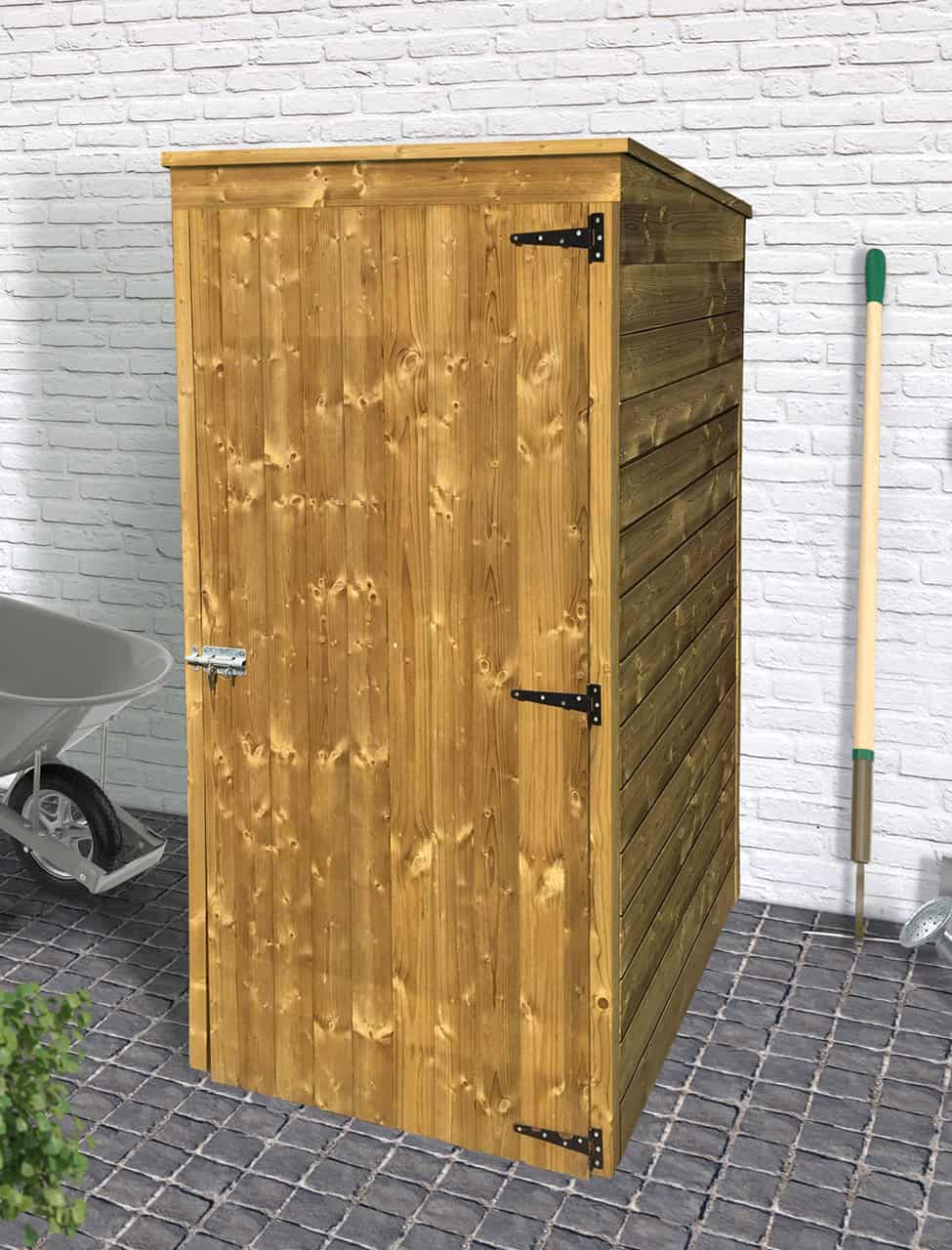 Armadio da giardino in legno di Abete trattato in autoclave, pronto per l’esterno. L’armadio da esterno in legno è la soluzione ideale per ordinare ed organizzare il giardino ed il terrazzo! Provvisto di pavimento e tetto con rotolo in guaina bituminosa protettiva.