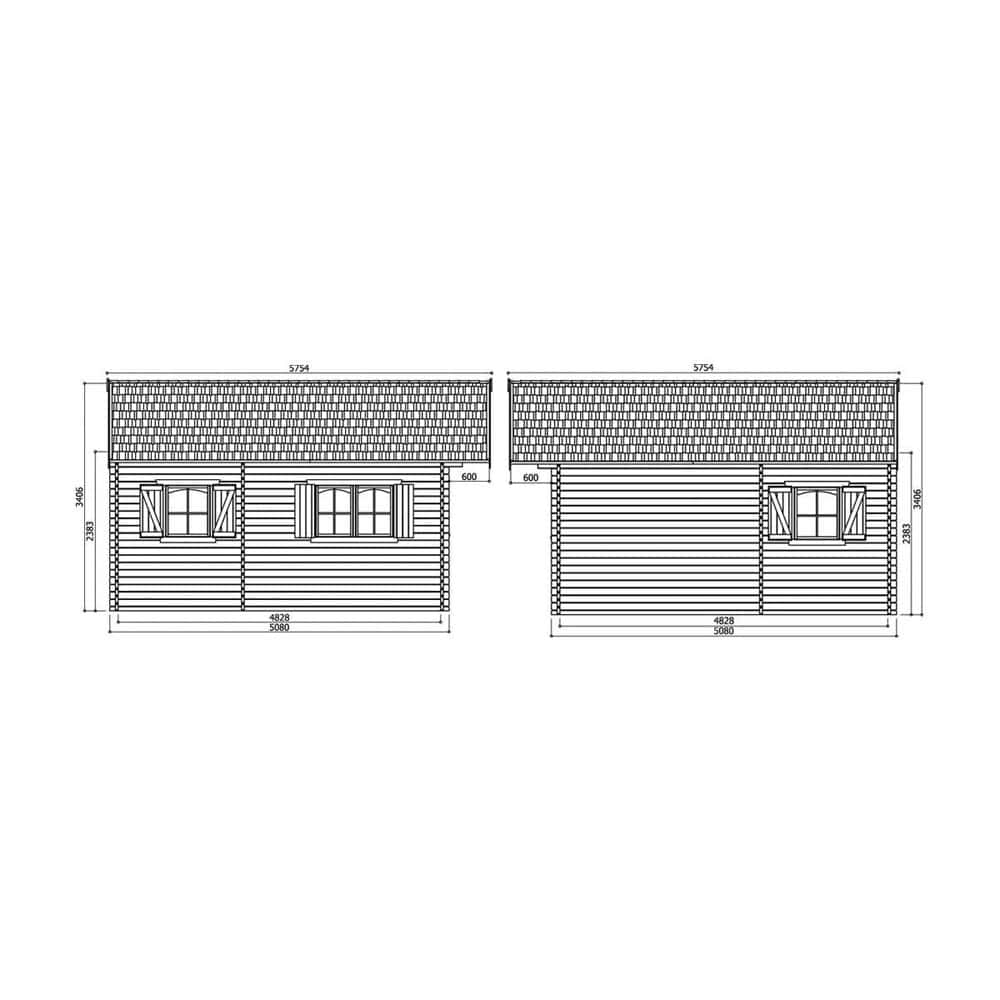 – Tetto con pendenza 14°. Lo spessore è di 16 mm con tegole bituminose rosse. Resistenza alla neve di 75 kg/mq