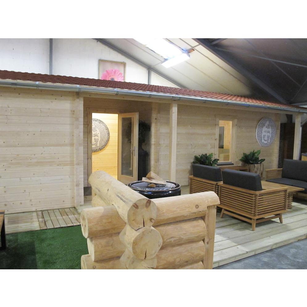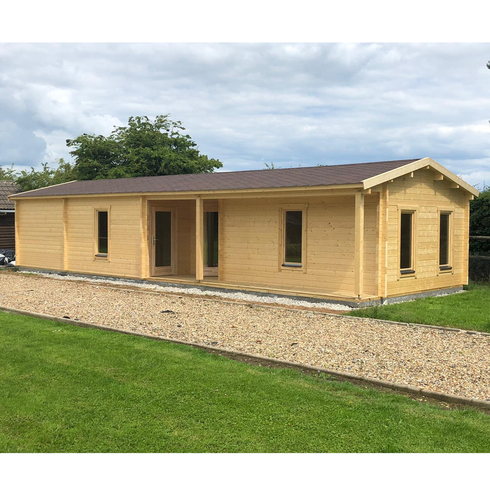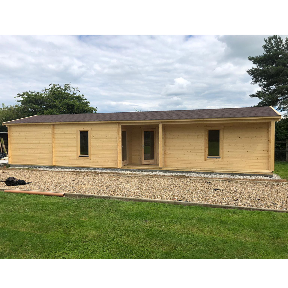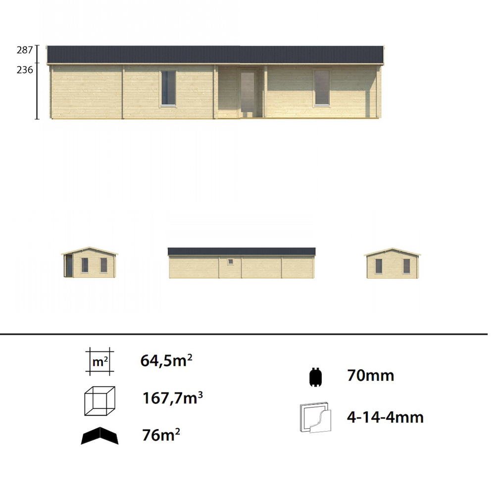 Prevede una Porta d’entrata ad anta singola vetrata e 7 Finestre per garantire un’ottima illuminazione. I vetri doppi e lo spessore del legno di 70 mm la rendono ben isolata dall’esterno e fruttabile come casa in legno abitabile per gli ospiti, taverna, studio, palestra ecc…