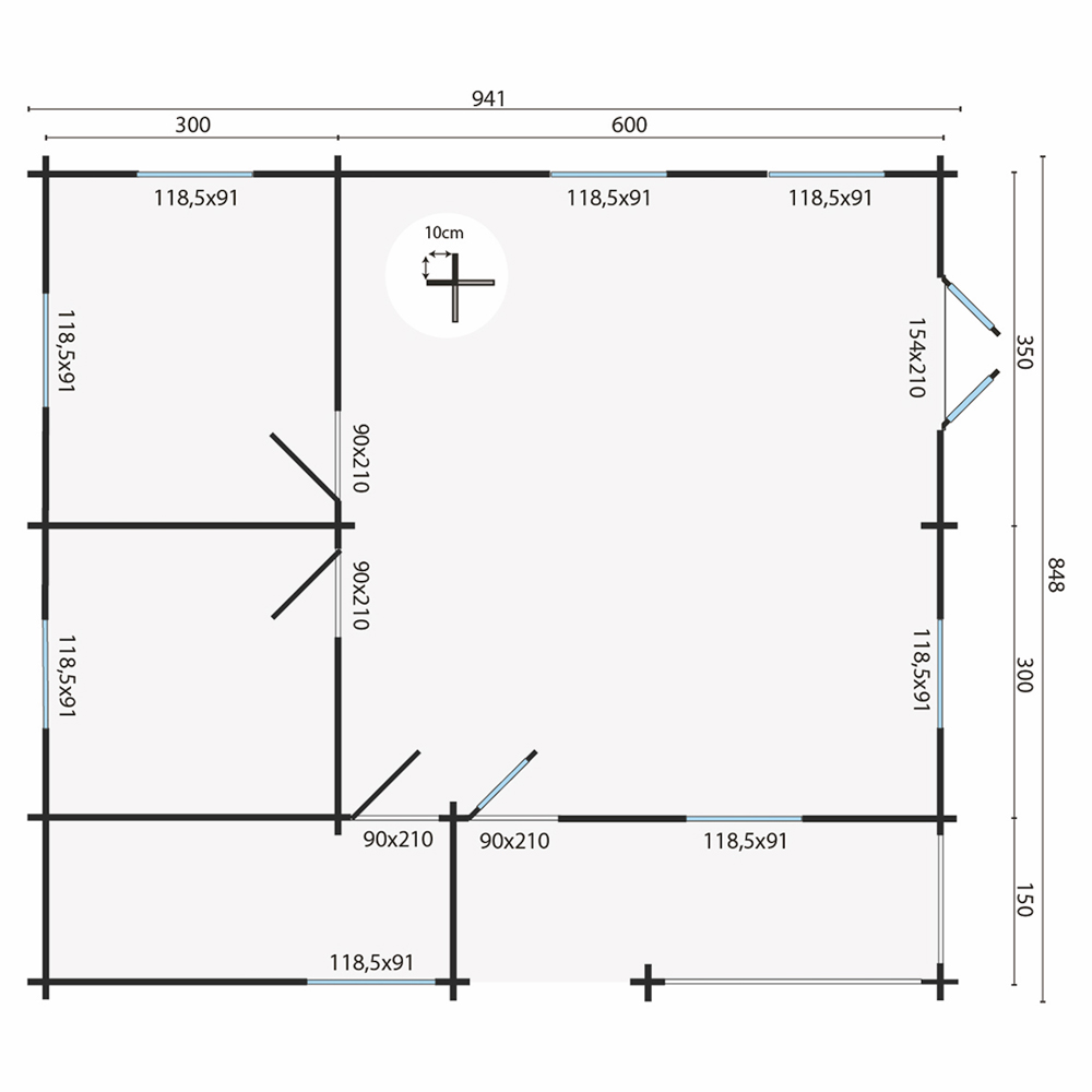- Dimensioni esterne – tetto escluso: 941 x 848 x 243 cm