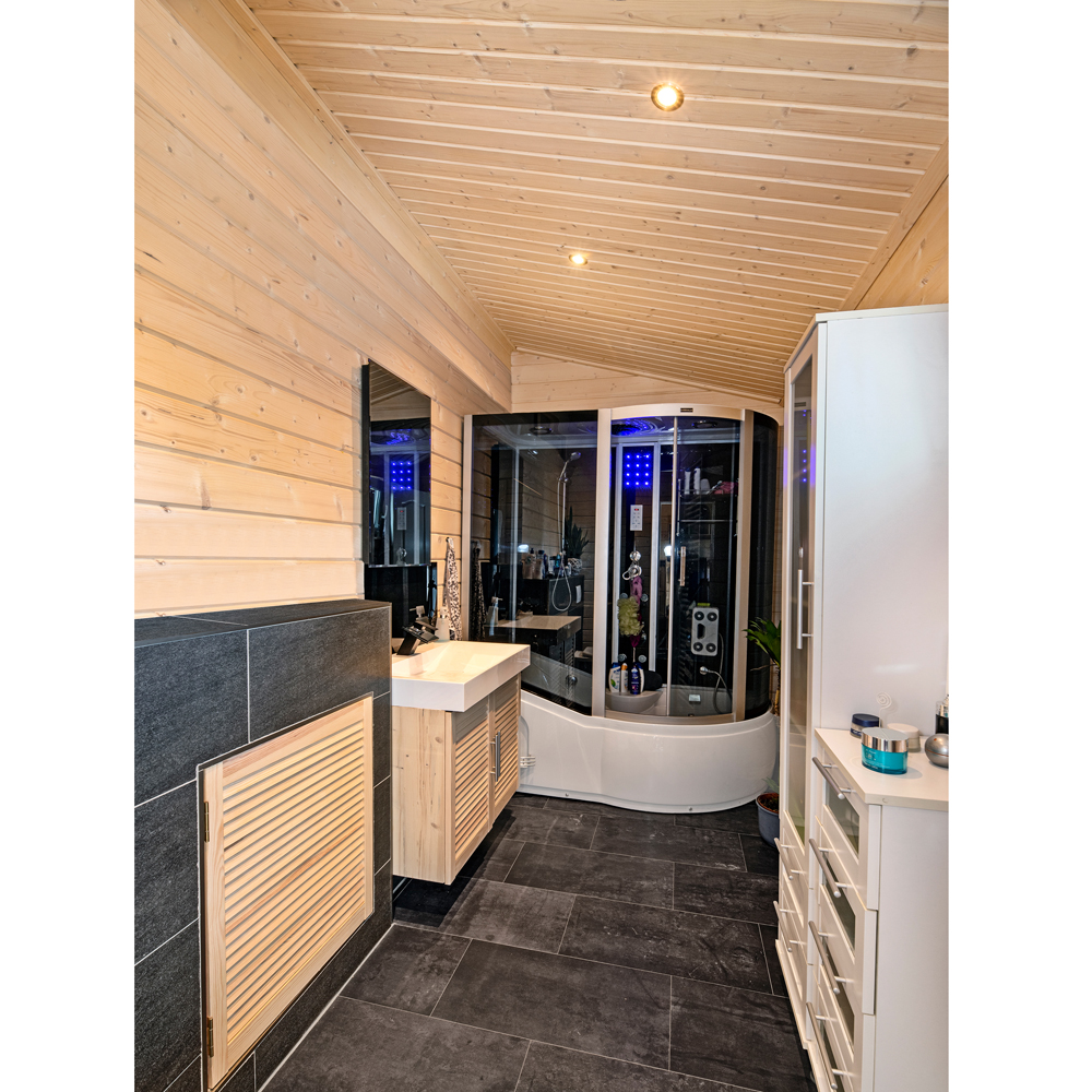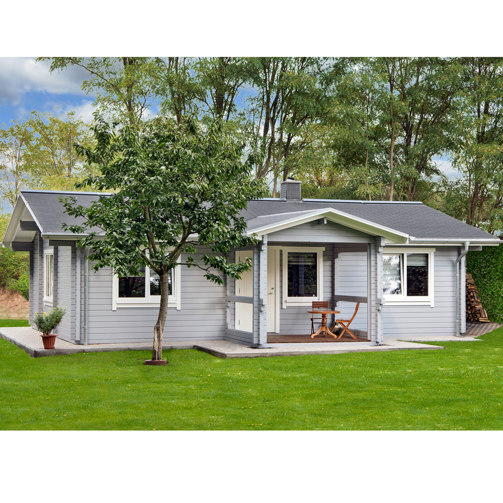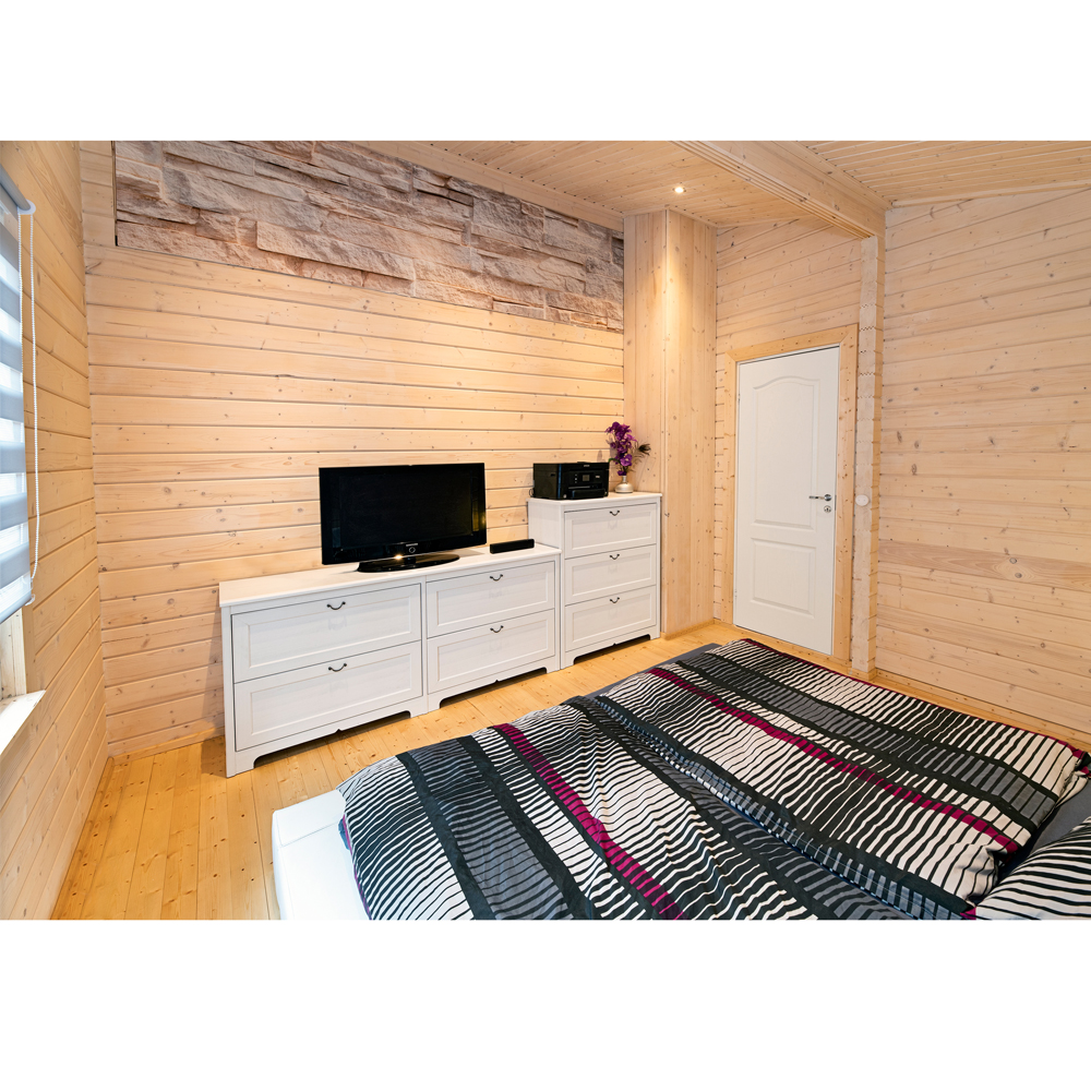 Prevede una Porta d’entrata anta singola vertata con Tettoia . Un comoda Porta sul restro e 7 Finestre per garantire un’ottima illuminazione. I vetri doppi e lo spessore del legno è di 92 mm la rendono ben isolata dall’esterno e sfruttabile come casa in legno abitabile per gli ospiti, taverna, studio, palestra, locale ecc…