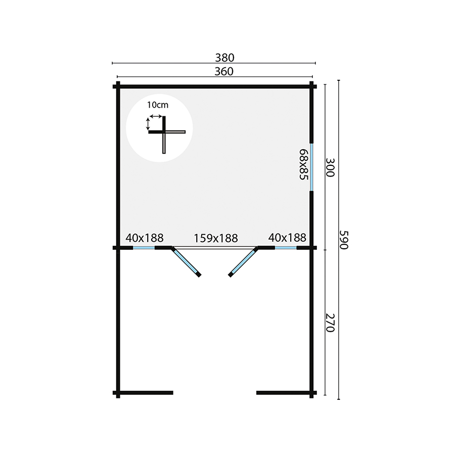 - Dimensioni esterne – tetto incluso: 380 x 590 x 270 h cm