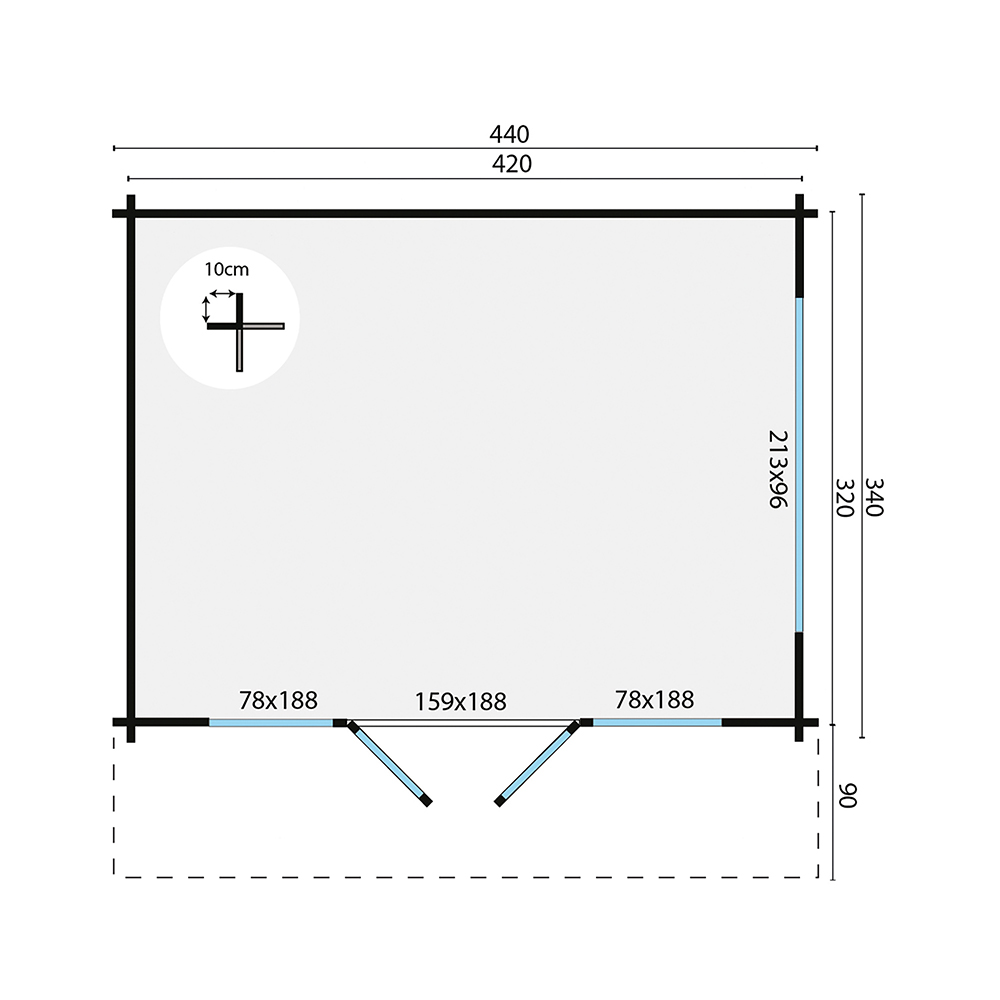 - Dimensioni esterne casetta – tetto escluso: 440 x 340 x 207 cm