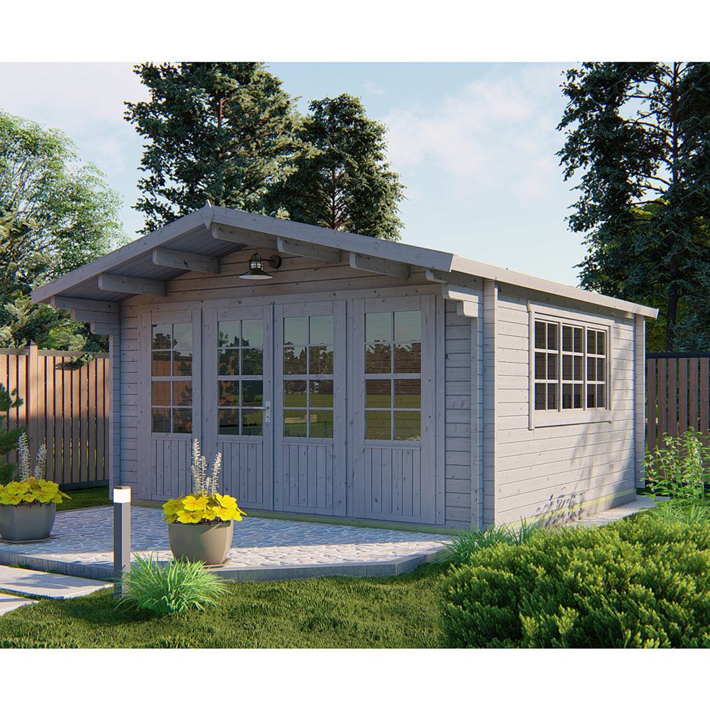 Casetta in Legno da giardino modello Blackpool, possiede una comoda tettoia ideale per un ingresso riparato anche in caso di mal tempo e per attenuare i raggi solari nel periodo estivo.