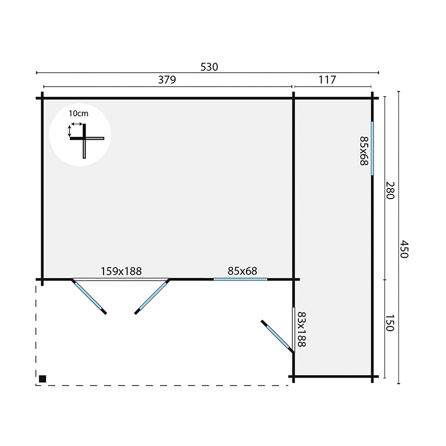 - Dimensioni esterne – tetto escluso: 530 x 450 x 207 h cm