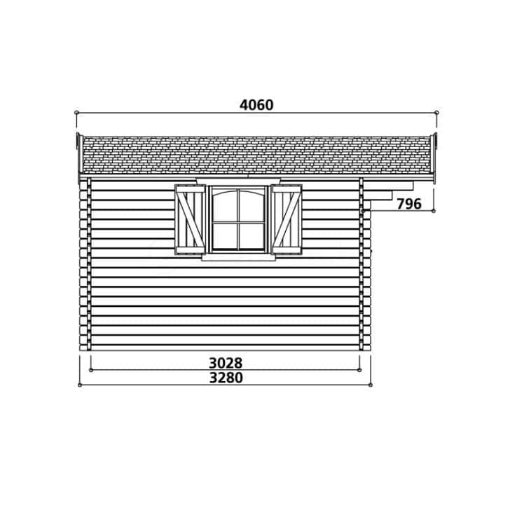 – Tetto con pendenza 14°. Lo spessore è di 16 mm con tegole bituminose rosse. Resistenza alla neve di 75 kg/mq
