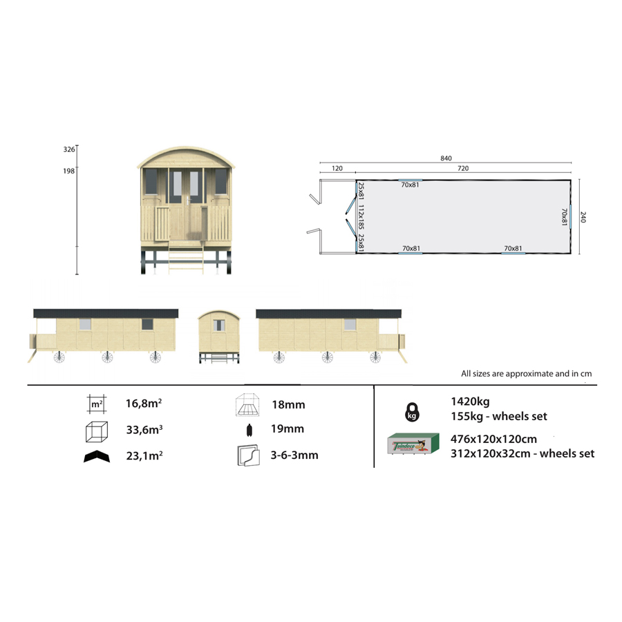- Dimensioni esterne tetto escluso- 840 x 240 x 198 cm
