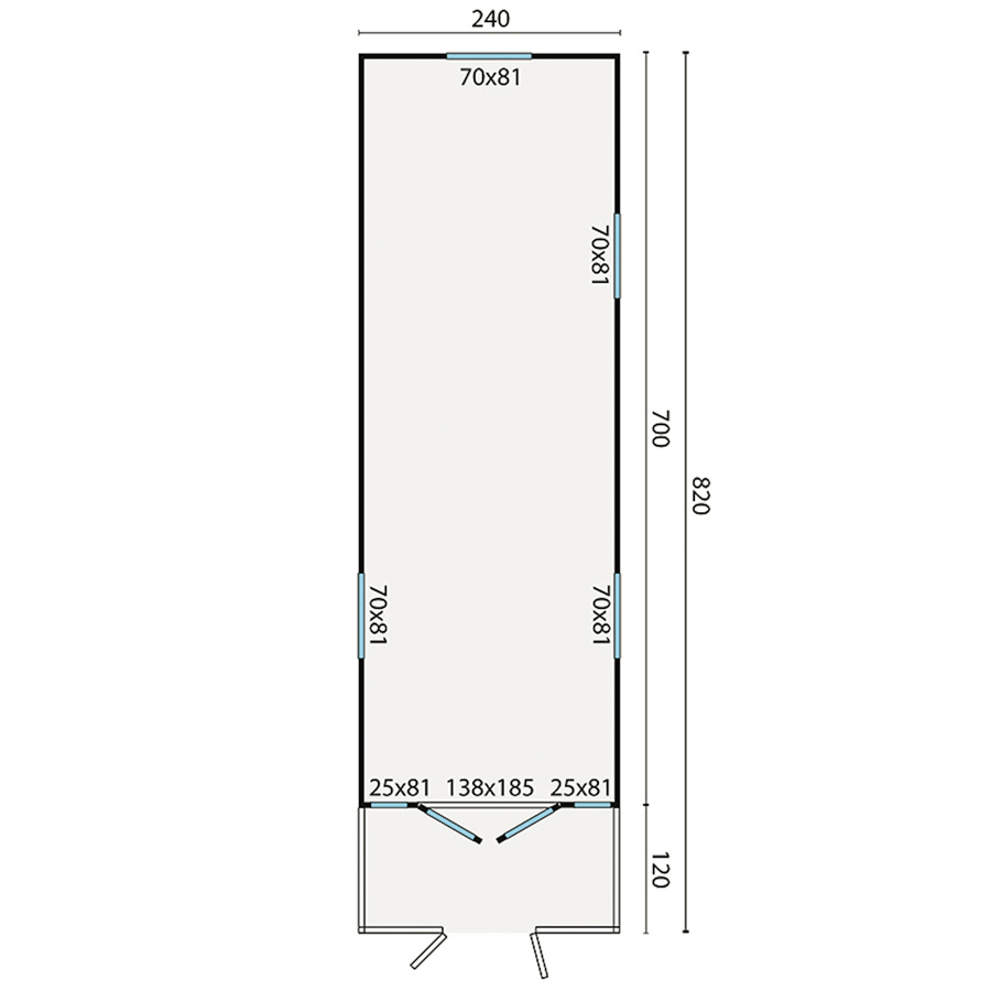 - Dimensioni finestre: L 70 x H 81 cm – L 25 x H 81 cm