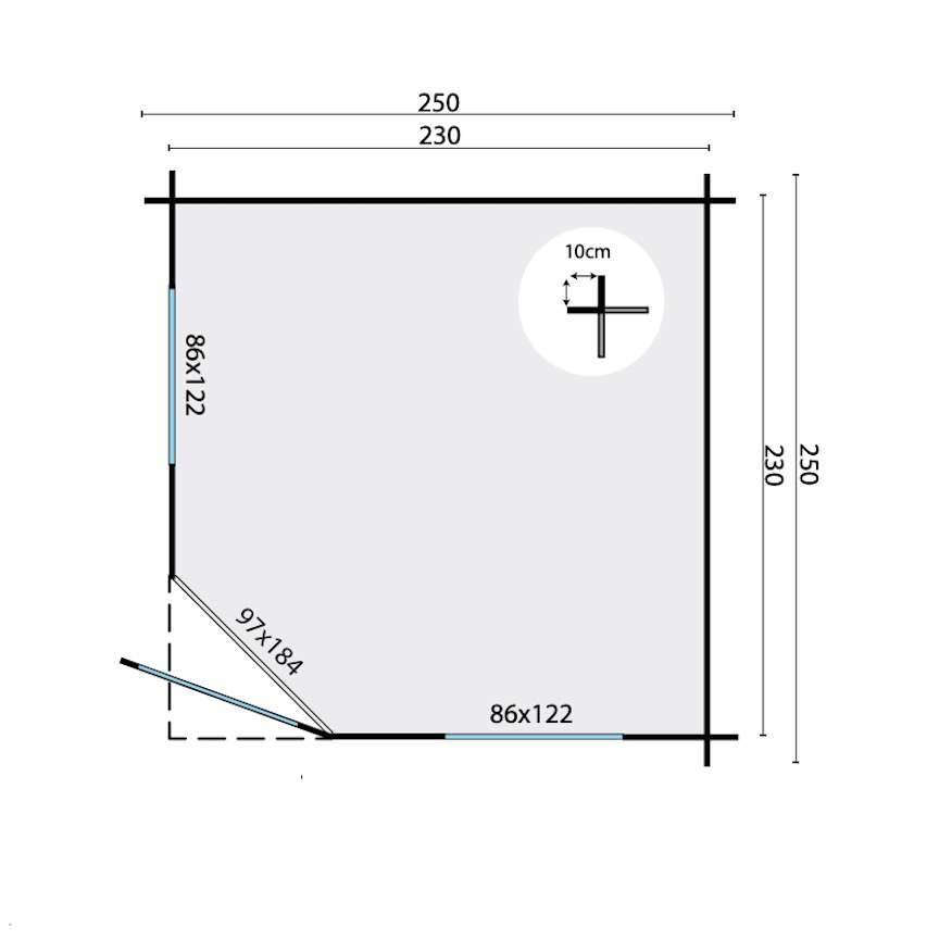 - Dimensioni esterne – tetto escluso: 250 x 250 x 211 h cm