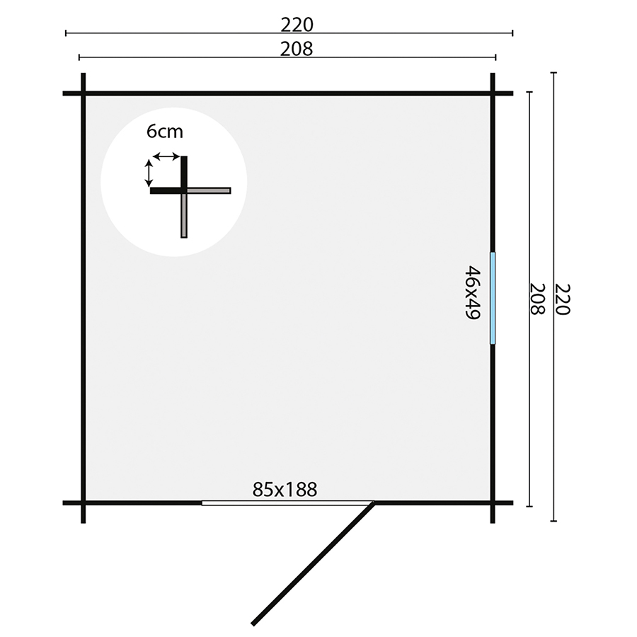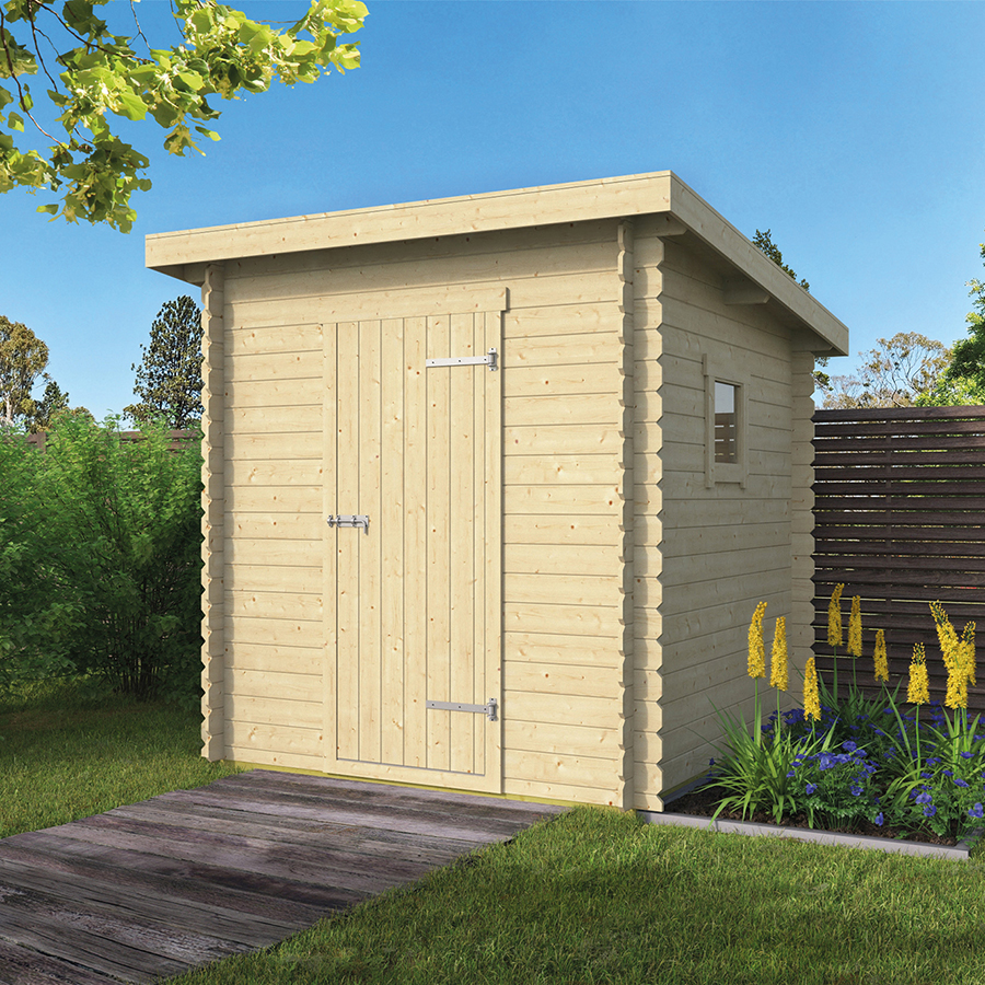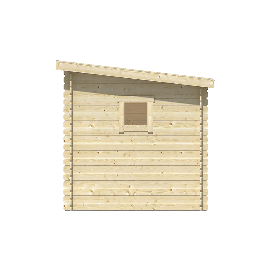 Casetta in Legno da giardino modello Eigo, composta da un’unica stanza, raggiungibile tramite porta ad anta singola.
