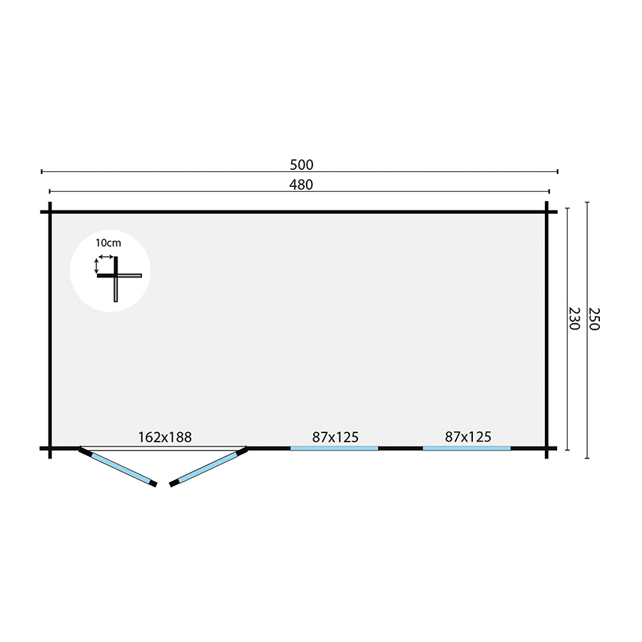 - Dimensioni esterne – tetto escluso: 500 x 250 x 209 h cm
