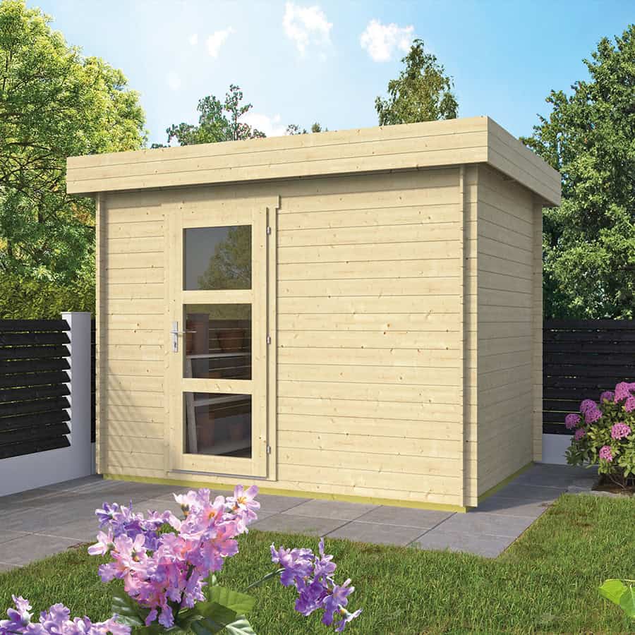 Casetta in Legno da giardino modello Novalie, composta da un’unica stanza, raggiungibile tramite elegante porta ad anta singola finestrata.