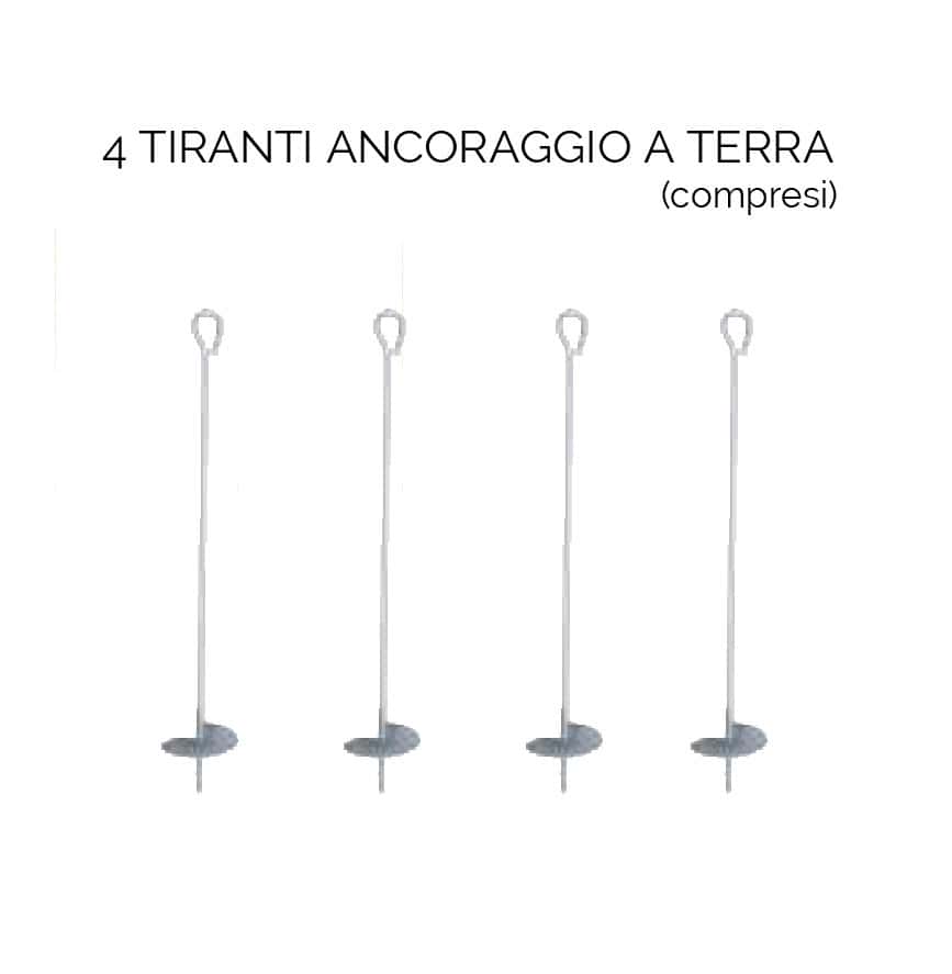 Arriva in kit di montaggio con ferramenta e 4 tiranti di ancoraggio a terra compresi