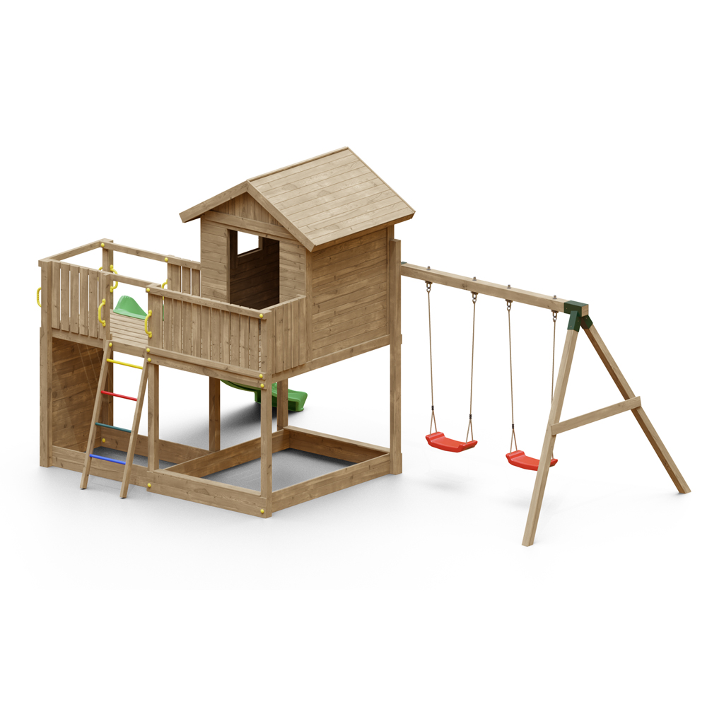 Parco Giochi in Legno da Giardino Galaxy S con torre d’avvistamento, altalene e scivolo per il divertimento illimitato dei tuoi bambini.