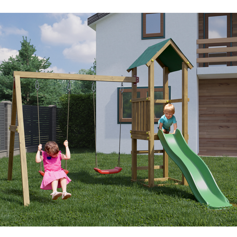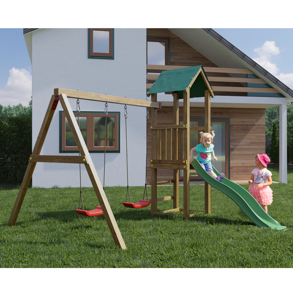 Parco Giochi in legno da Giardino in Legno Fungoo Lucas Torre d’Avvistamento con Due Altalene e Scivolo per un Divertimento illimitato.