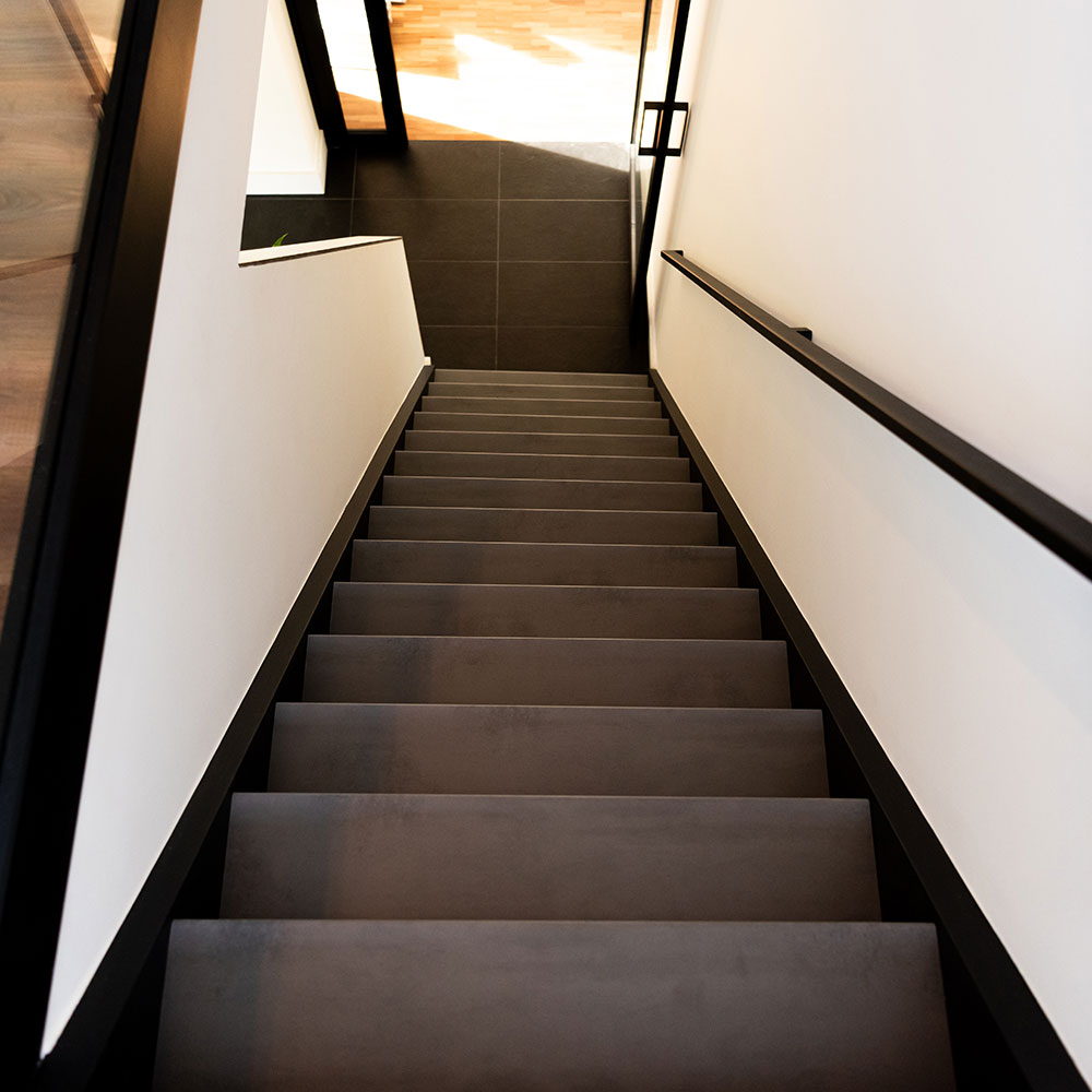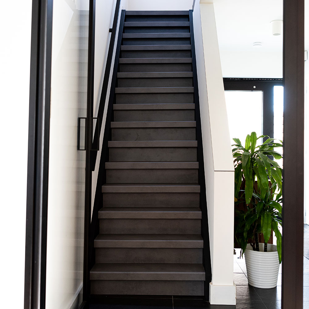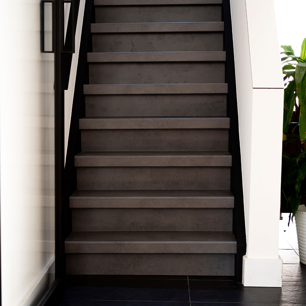 Rivestimento per Scale interne Dark Grey Stone in Laminato AC4 spessore 8 mm. Rivesti la tua scala interna con Gradini, Pianerottoli, Alzate, Bordi di finitura e Profili di partenza.