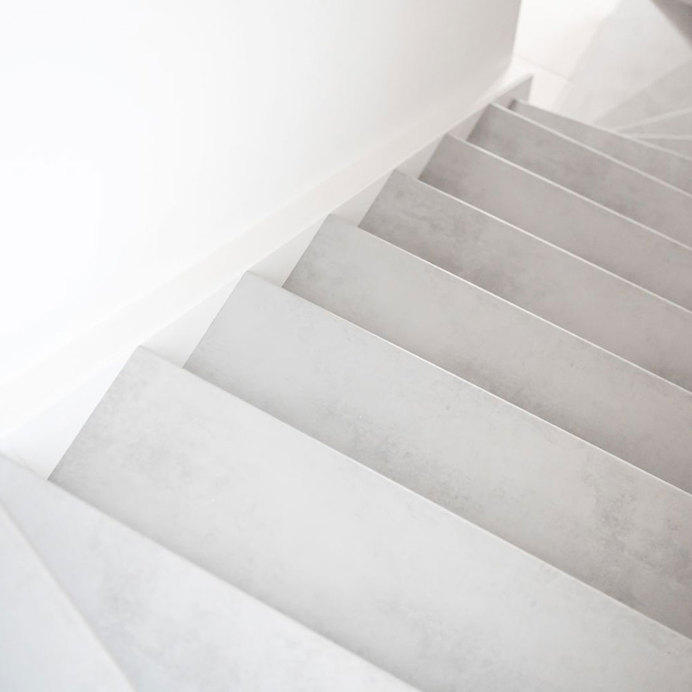 Rivestimento per Scale interne Light Grey Stone in Laminato AC4 spessore 8 mm. Rivesti la tua scala interna con Gradini, Pianerottoli, Alzate, Bordi di finitura e Profili di partenza.