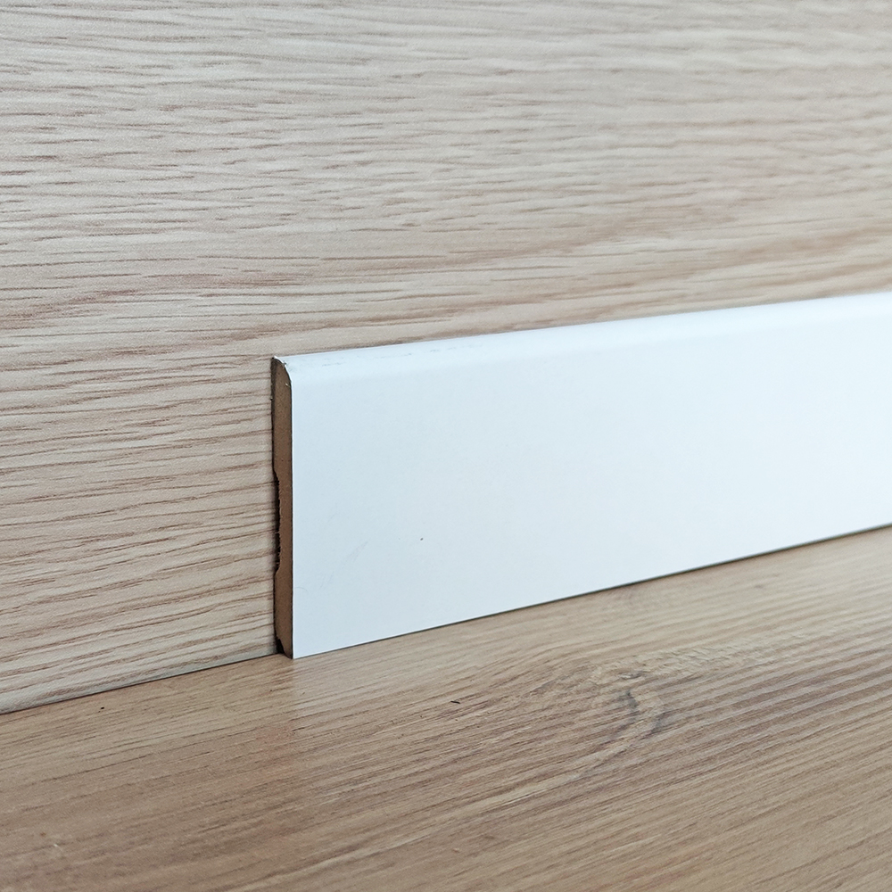 Battiscopa MDF Bianco rivestito in carta melaminica, soluzione economica consigliata per abbinare facilmente il battiscopa al tuo pavimento.