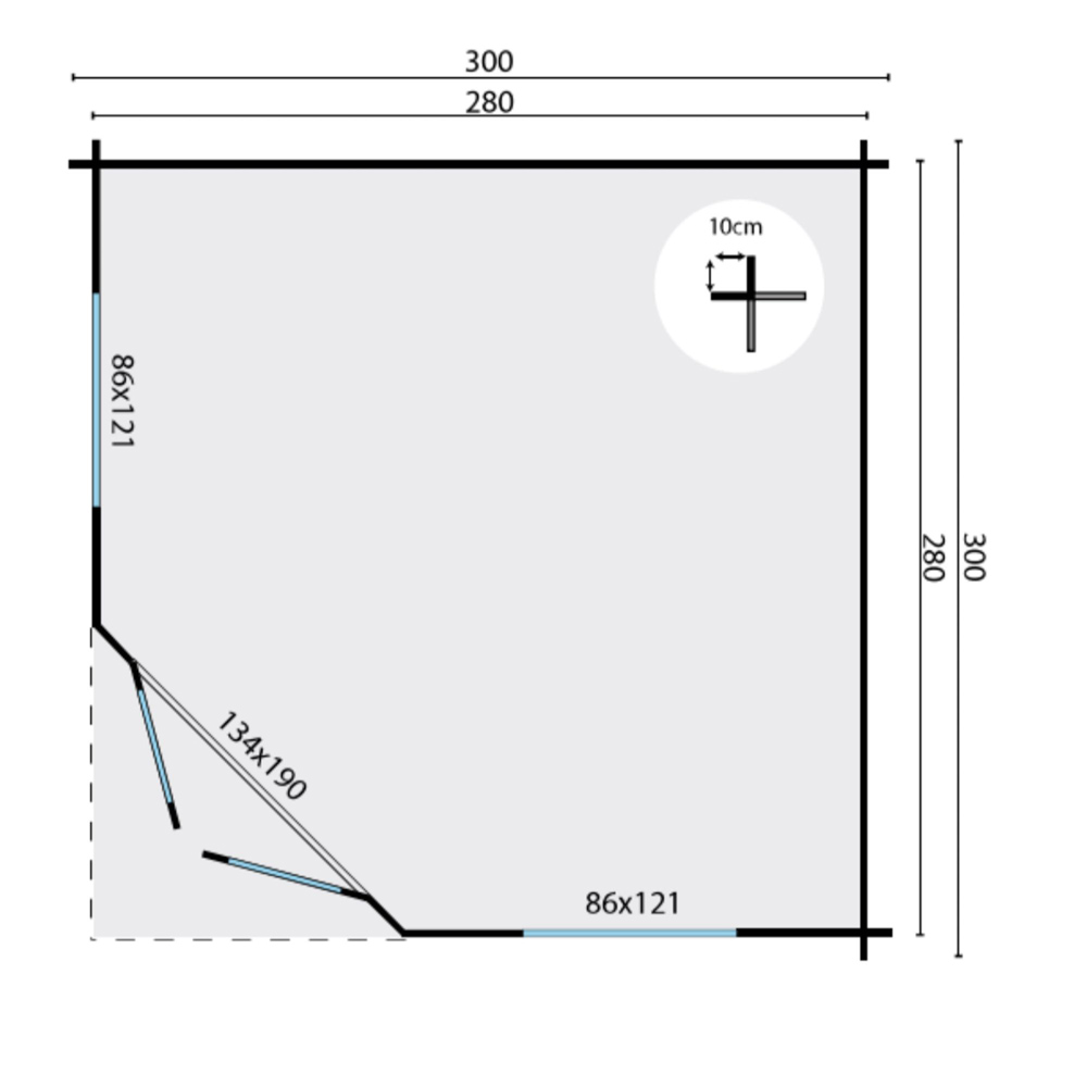 - Dimensioni esterne – tetto escluso: 300 x 300 x 211 h cm