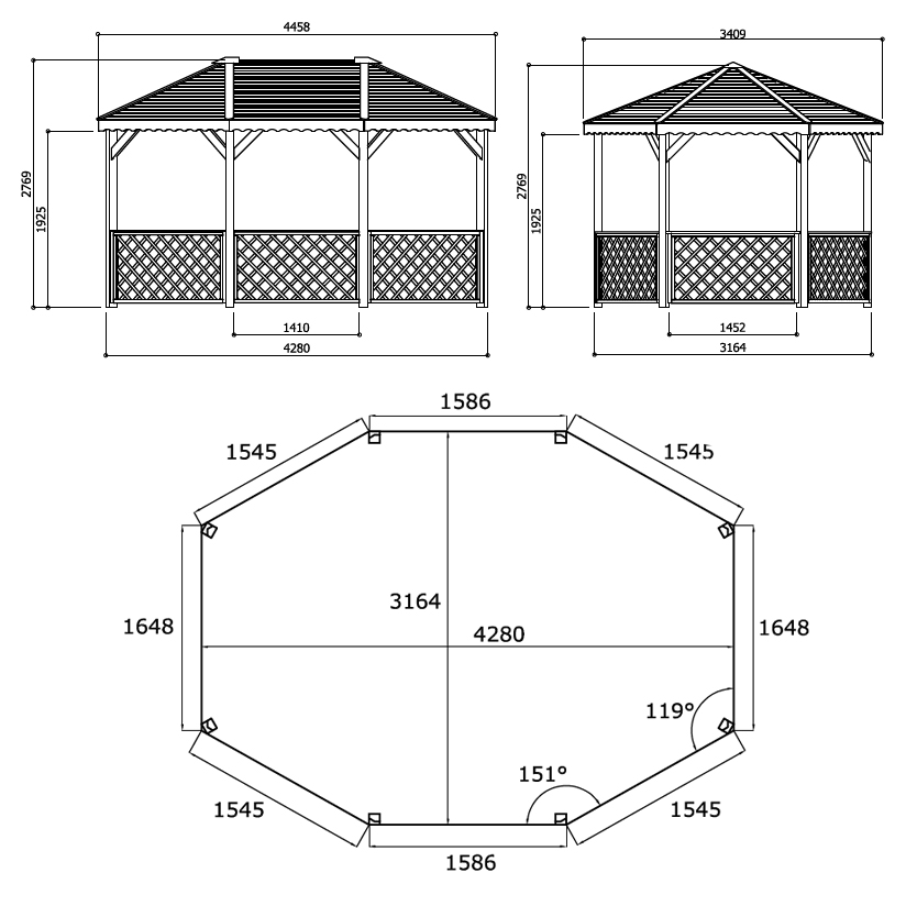 Gazebo in Legno PAVILION interamente realizzato con pino trattato in autoclave, pronto per l’esterno senza bisogno di manutenzione