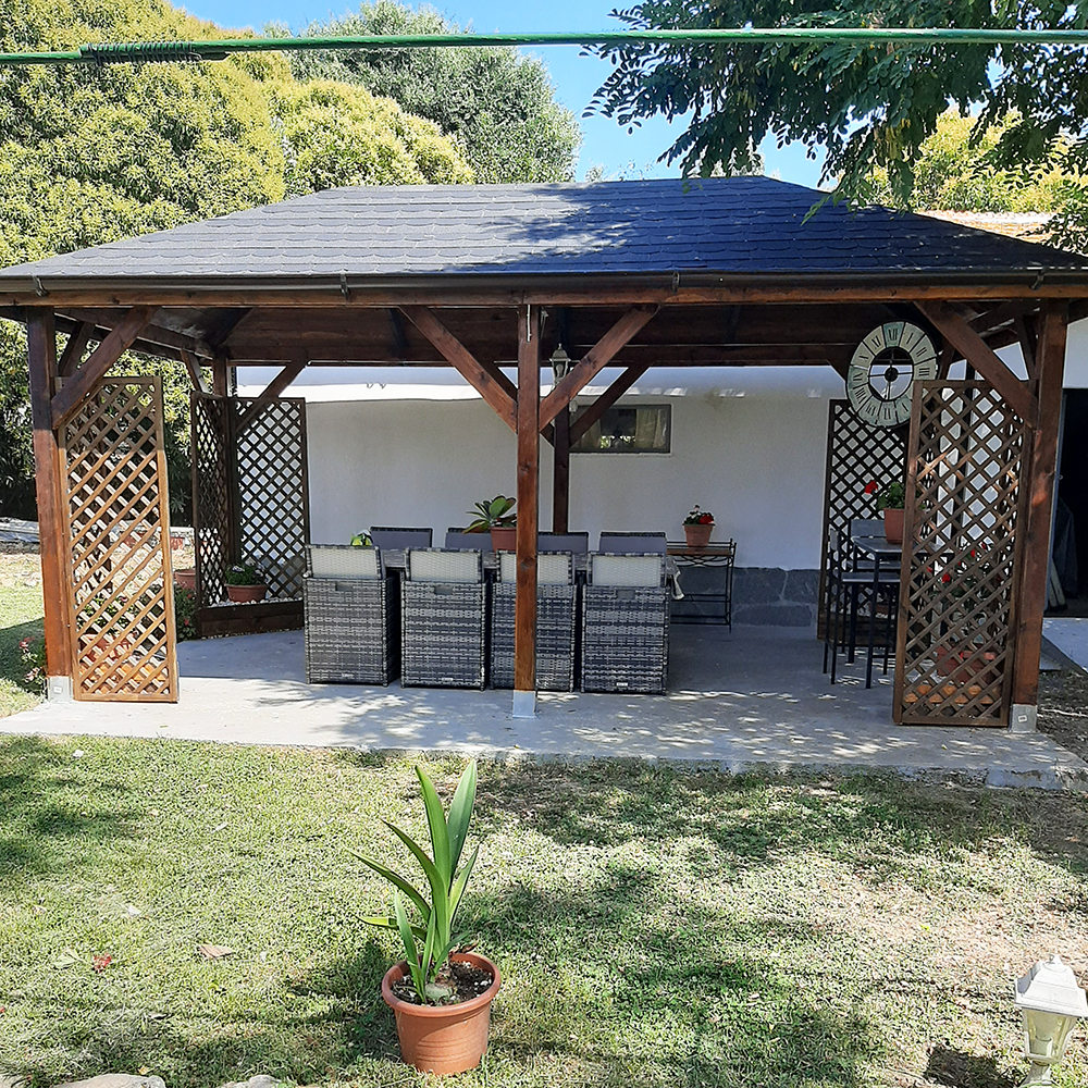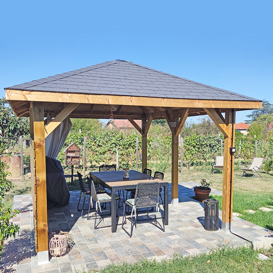 Gazebo in Legno di Pino impregnato in autoclave, già protetto per l’esterno, con Tetto in legno.