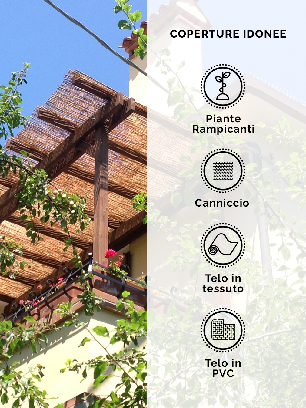 Ti ricordiamo che la Pergola BASIC è adatta solo a coperture leggere come teli in tessuto o pvc, rampicanti e canniccio.