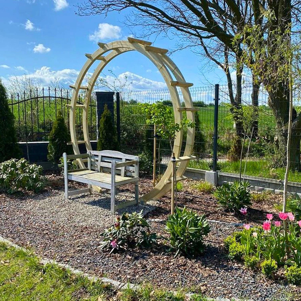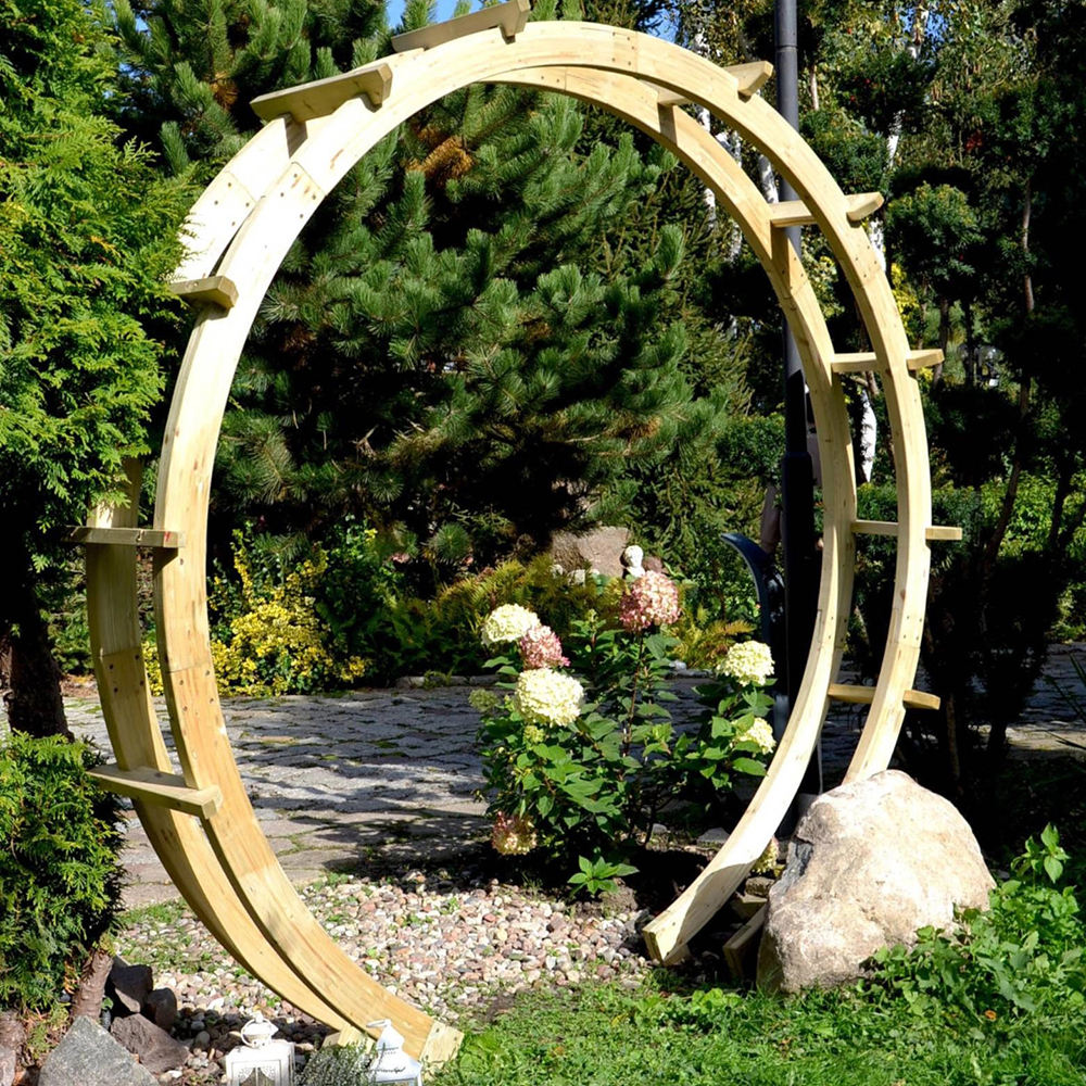 Pergola ad arco circolare in legno di pino autoclavato, pronta per l’esterno senza bisogno di manutenzione.