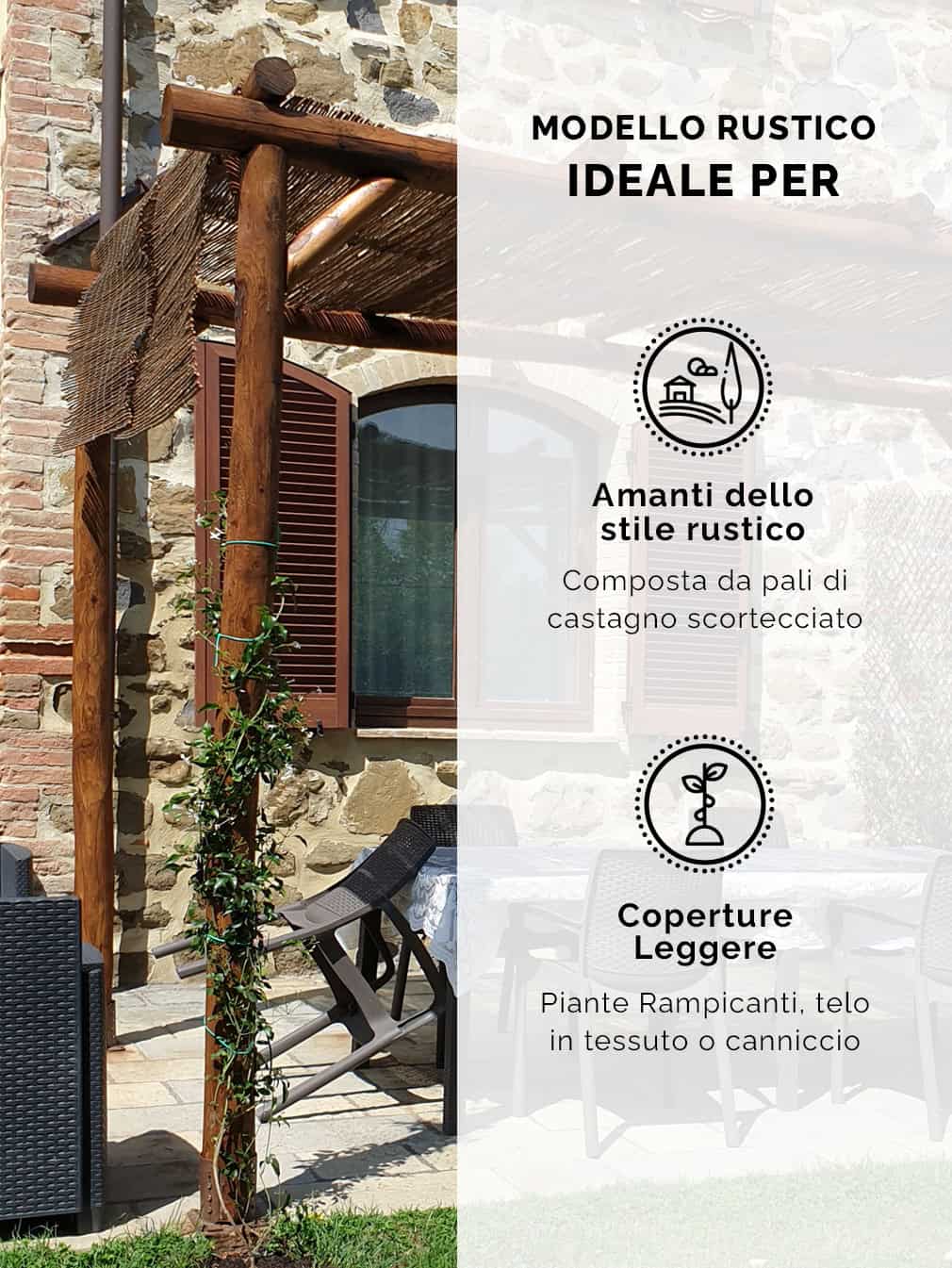 Ti ricordiamo che la Pergola RUSTICA è adatta solo a coperture leggere come teli in tessuto o pvc, rampicanti e canniccio.
