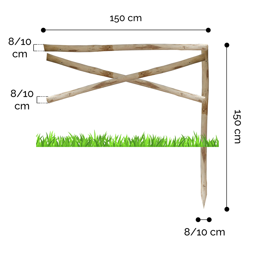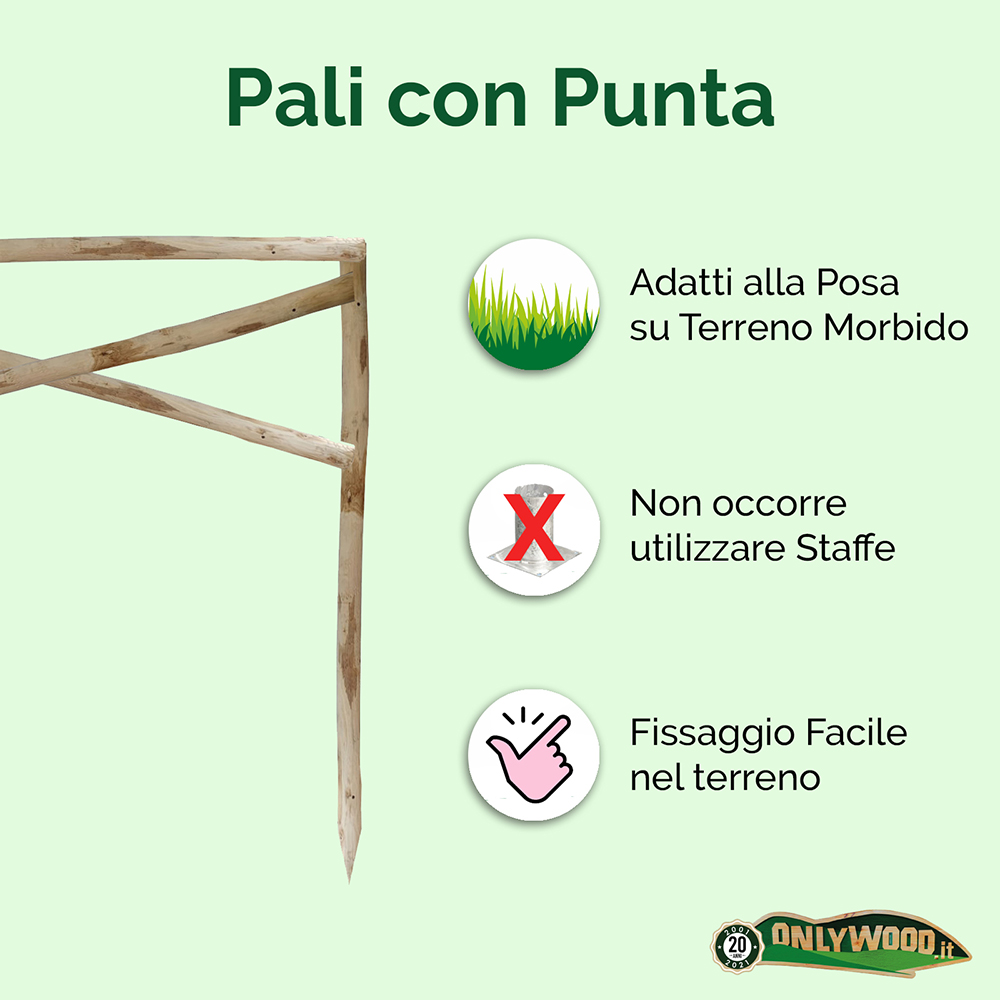 Le Recinzioni in Legno Onlywood possono essere fissate facilmente al terreno grazie alla Punta alle estremità dei piantoni. La punta permette il fissaggio su Superfici Morbide come prato e terreno (non su superfici dure come il cemento). L’ancoraggio al suolo è facile ed immediato, senza necessità di acquistare staffe in un ferramenta! I pali hanno altezza totale di 150 cm e devono essere interrati circa 40 cm.