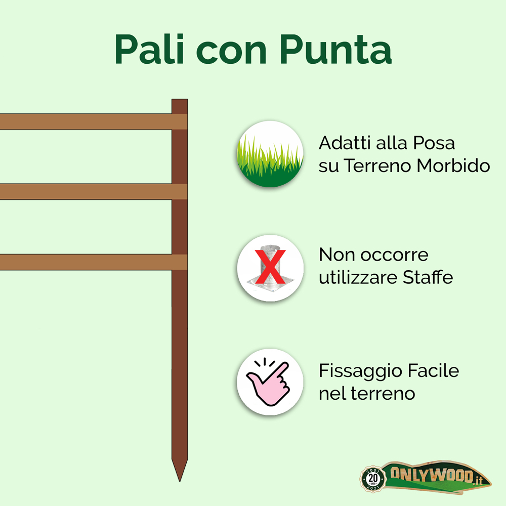 I pali montanti della staccionata per cavalli hanno lavorazione con Punta, ideale per il fissaggio su Terreno o Superficie Morbida. Occorre interrare il palo di 50 cm (considera che così la Staccionata in legno avrà un’altezza fuori terra di 100 cm).