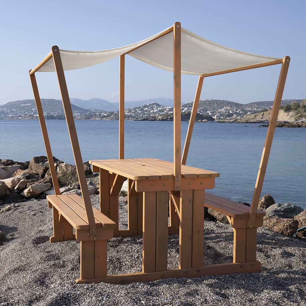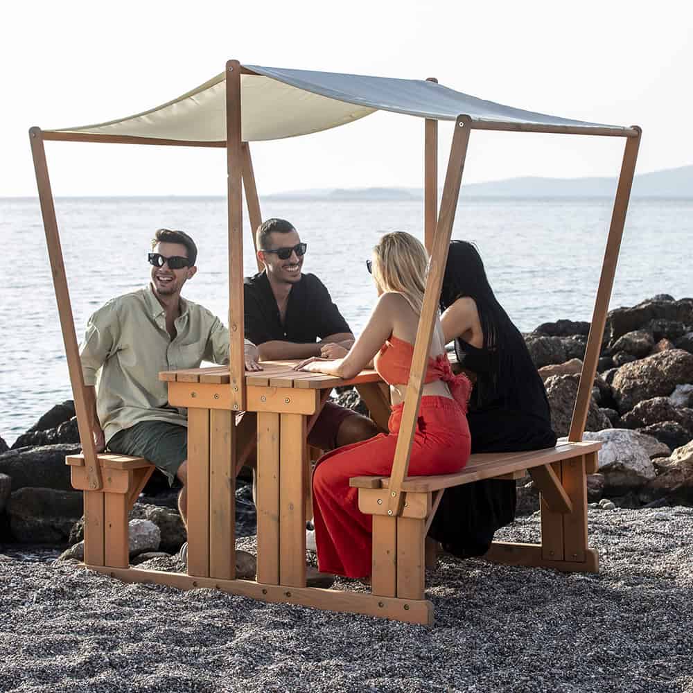 Tavolo picnic in legno verniciato nel color arancione, caratterizzato da una comoda tettoia con telo ombreggiante compreso.