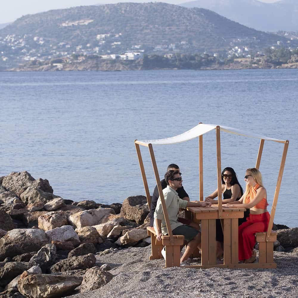 Il tavolo picncin in legno è provvisto di panche fisse per ospitare fino a 4 persone.