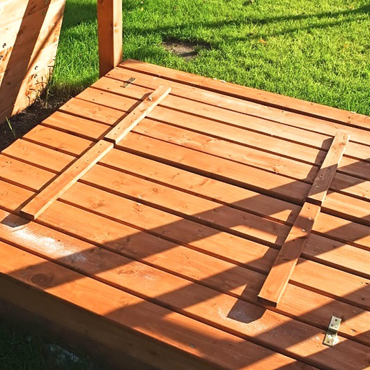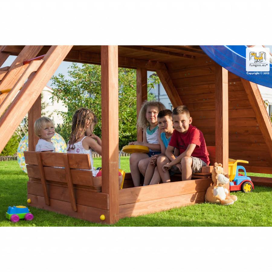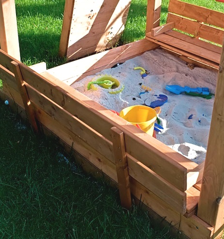 Sandbox per divertenti giochi con la sabbia, progettata con comode panche con schienali..