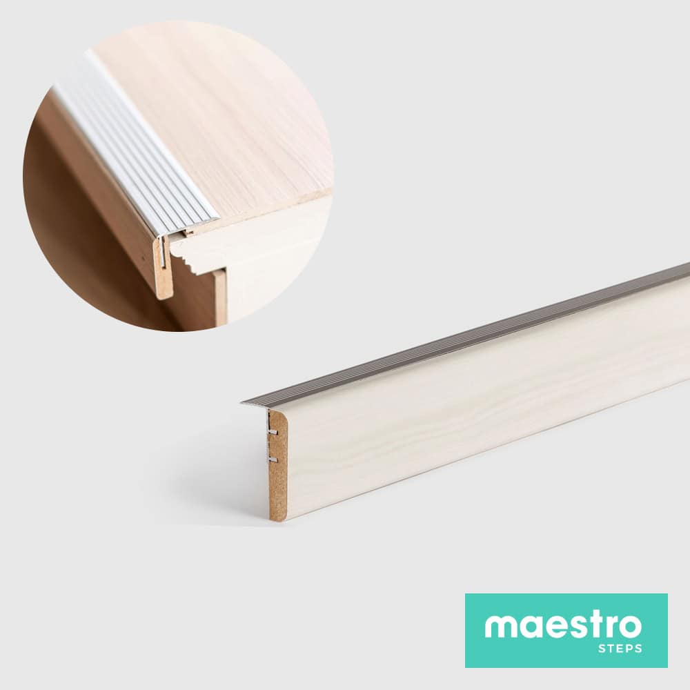 La confezione comprende: il Profilo in alluminio dimensioni 130 x 3 x 2 cm e una Costa in Laminato Effetto Nebraska Oak dimensioni 130 x 5,6 x 1,2 cm.