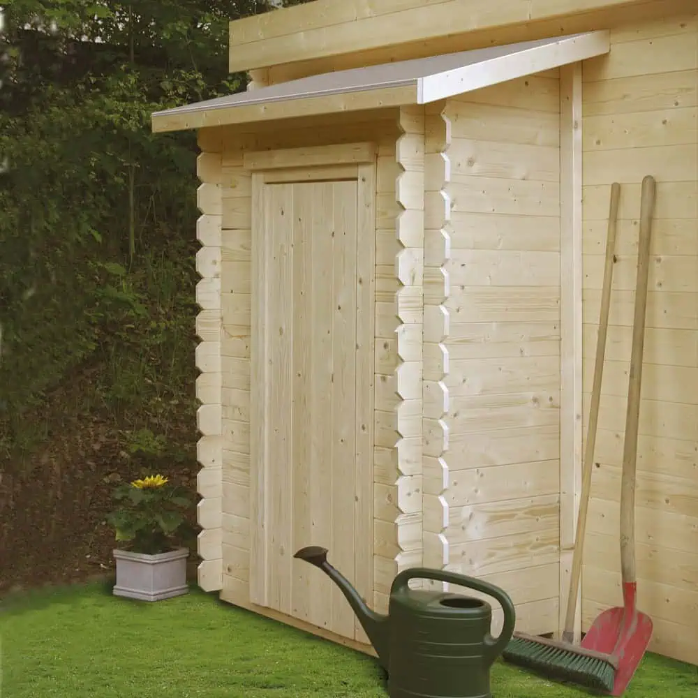 Ripostiglio addossato in legno con copertura in guaina ardesiata nera, accessorio per casetta da giardino